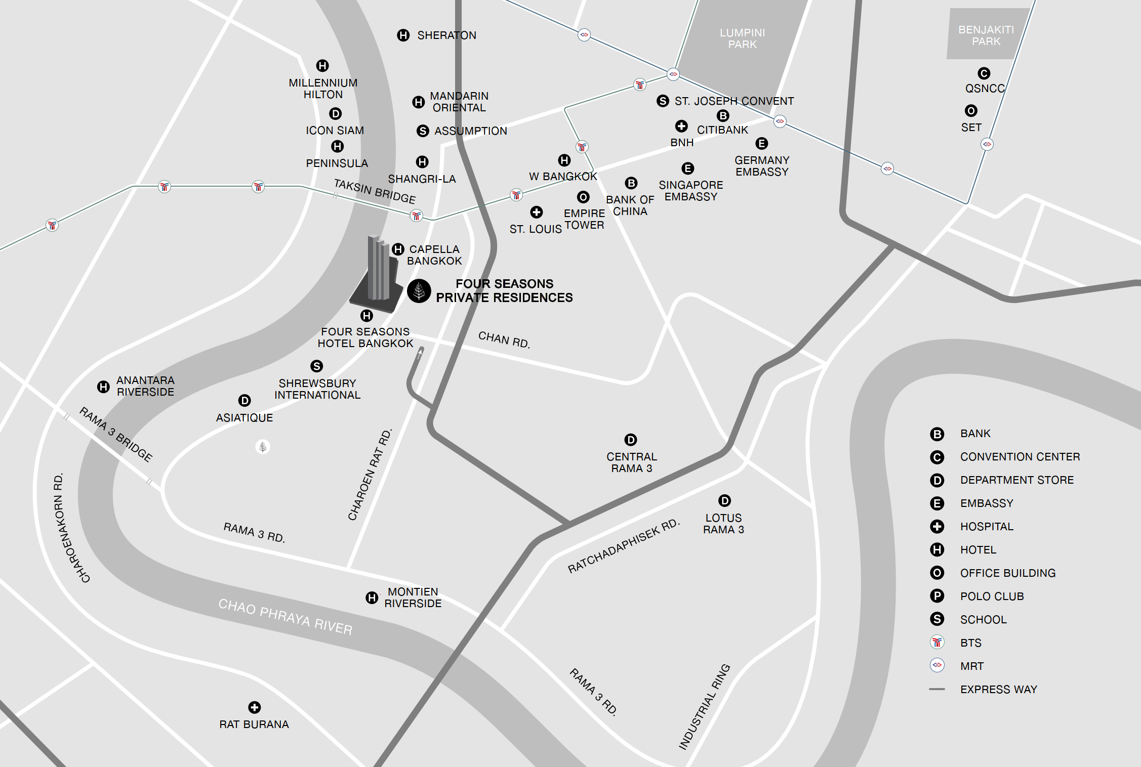 Four Seasons is the part of Chaophraya Estate, which includes Four Seasons hotel, private residences and Capella hotel. Built on one the Bangkok’s last remaining waterfront golden sites, the estate encompasses over 14 acres (35-2-68 rai) of prime land along Chao Phraya River, with an unprecedented accessibility as well as 350 meters of waterfront real estate.