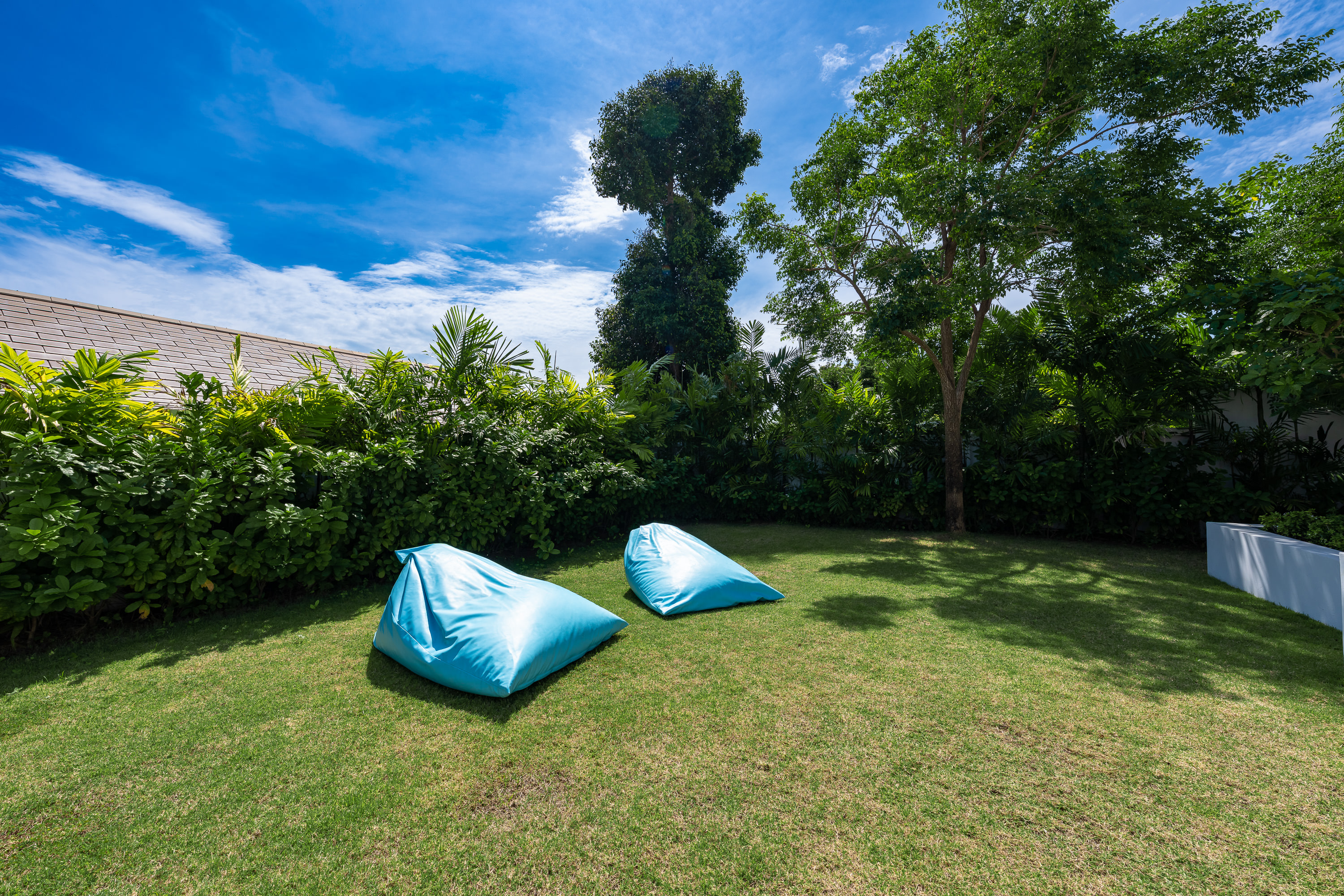 The villa’s large open-plan living area has a cooling vaulted ceiling that connects the lounge, dining area, and modern kitchen. Outside is a large garden area with a 12-meter swimming pool that serves as the focal point of the villa’s design. At the far end of the pool area, a sala sits beside the garden and provides a comfortable spot to lounge or dine.