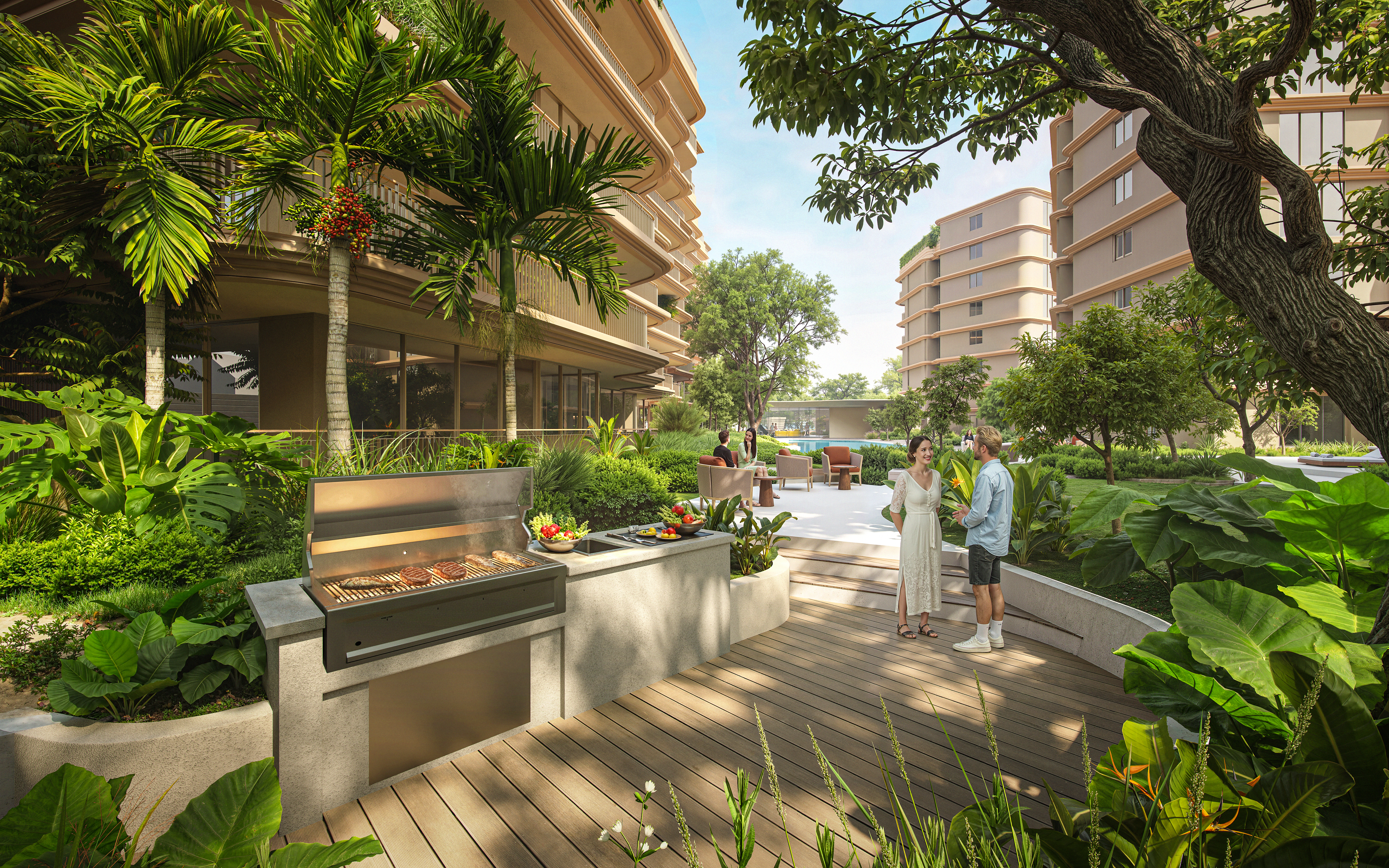 Laguna Golf Residences Hibiscus features serene gardens and four free-form communal pools, each with sundecks, alfresco BBQ areas, and shared spaces for social gatherings.