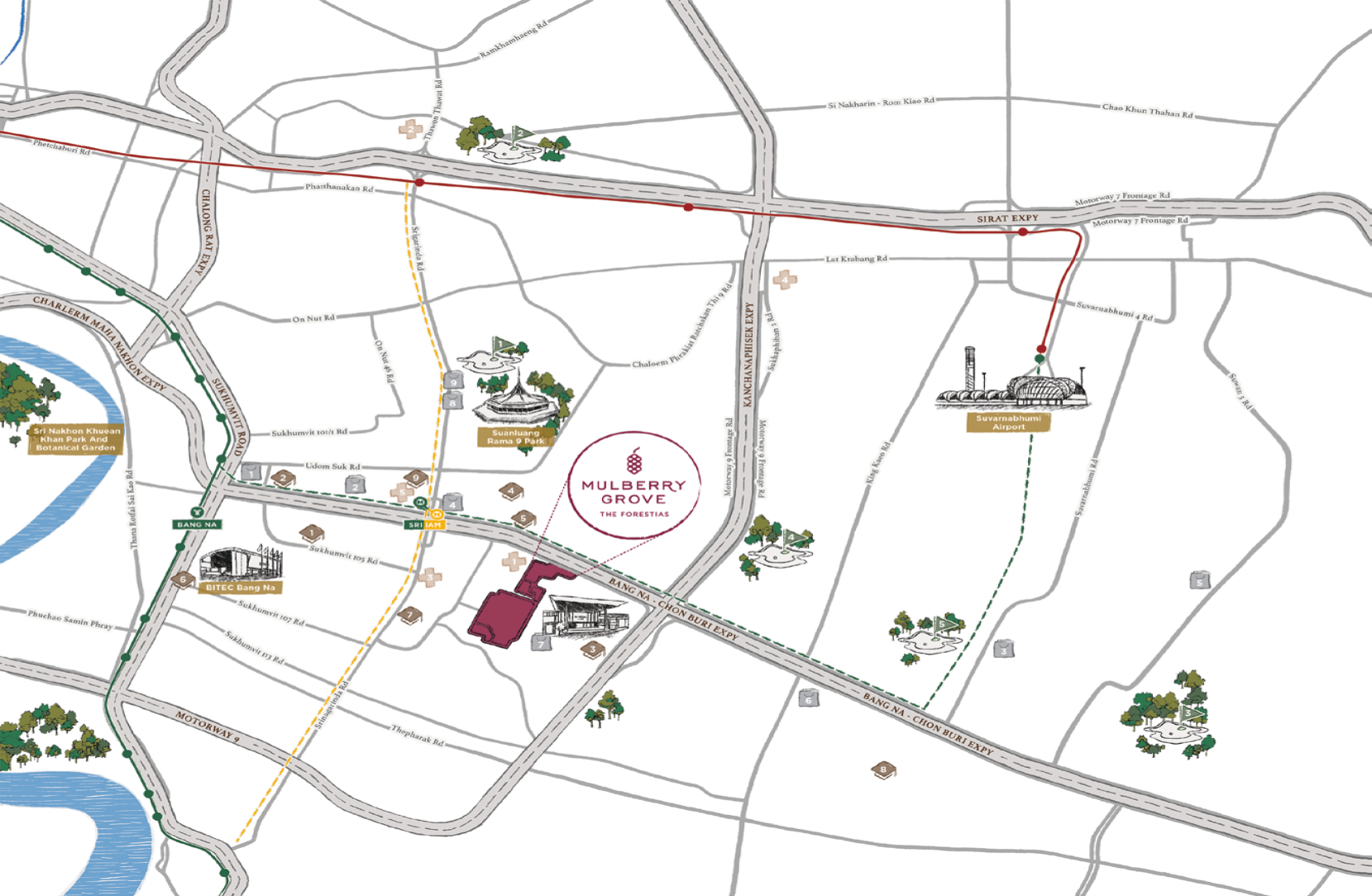 In the end of 2022, Bang Na will see the launch of MRT Yellow Line. The closest station - Si Lam MRT - will be located in 3 km from The Forestias. This same station may potentially become he intersection between Yellow line and BMA Bang Na - Suvarnabhumi line (the latter has just passed feasibility study stage in March 2022 and is currently undergoing project development).