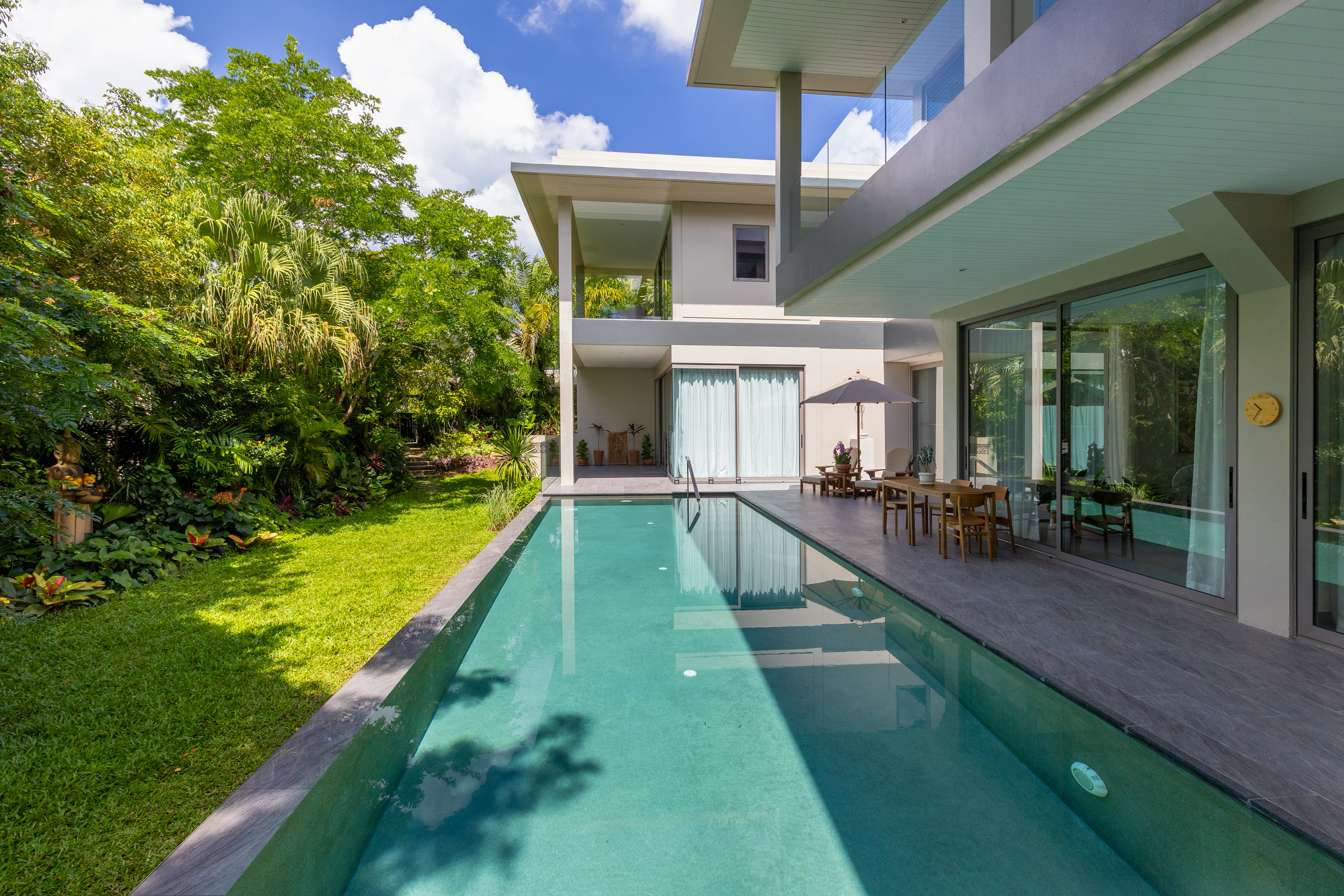Villa Mimosa is a two-storey private residence and one of only six homes within the gated grounds of The Pavilions Phuket, a five-star resort near Layan Beach. Set on a gently elevated plot surrounded by lush, landscaped gardens, the residence offers refined privacy and comfort, following a two-year renovation that has transformed the home into a serene, tropical sanctuary ideally suited for full-time living.