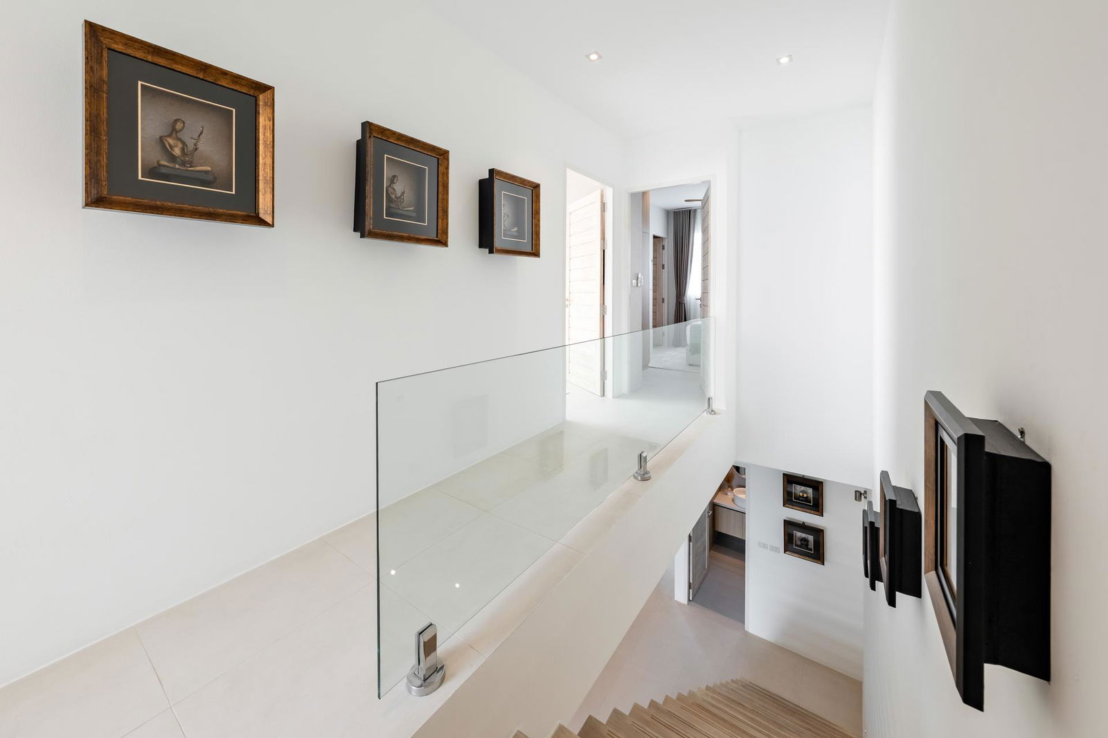 The villa itself spans three levels. The ground level includes a guest street parking, a covered garage for two cars, a large storage area, a games room, and a versatile fourth bedroom, with side access leading directly to the estate’s landscaped communal park. The middle level serves as the heart of the home, with an open-plan living, dining, and kitchen area seamlessly extending to the pool terrace and outdoor seating. The upper floor features the master suite with a private balcony overlooking the bay, two further guest bedrooms with en-suite bathrooms, and sweeping views over the estate and beyond.