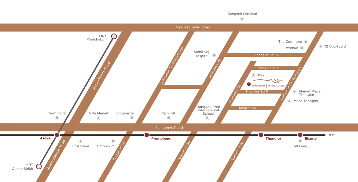 Комплекс Chalermnit Art de Maison расположен всего в 500 метрах от станции Thonglor BTS. Район Тонглор славится изобилием ресторанов, баров и магазинов, до которых легко добраться из комплекса. В пешей доступности имеется несколько торговых центров, в том числе J-Avenue, Eight Thonglor, Ginza Thonglor, Fifty Fifth Thonglor, theCommons и др.