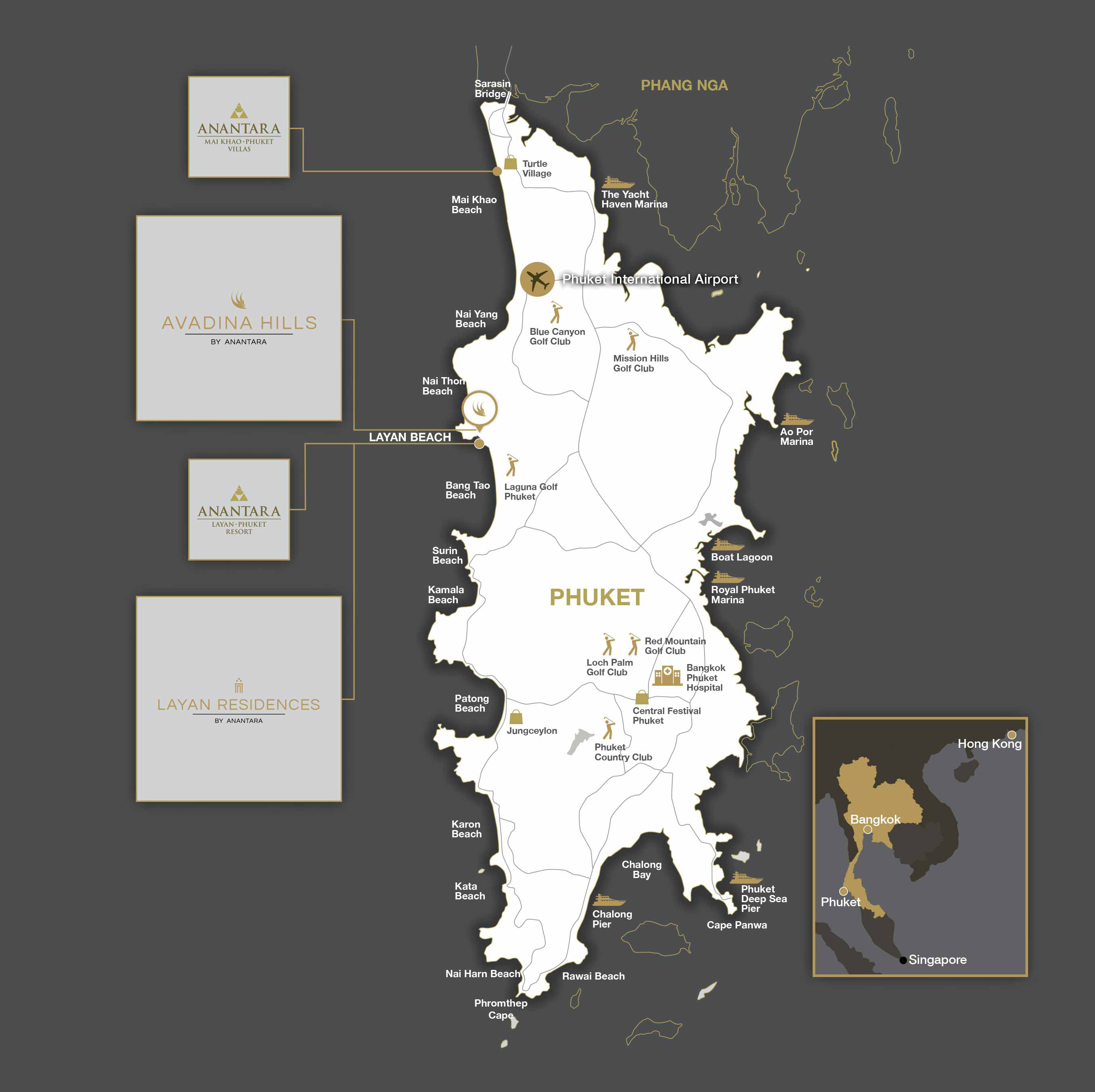 Anantara Layan Resort & Spa (и Layan Residences) находится в живописном идиллическом районе Лаян. Из самого отеля имеется выход на пляж с завидным прилегающим участком; объект Layan Residences расположен на возвышенном склоне холма, сзади отеля, благодаря чему отсюда открываются восхитительные виды, а береговая линия находится всего в 150-250 метрах.