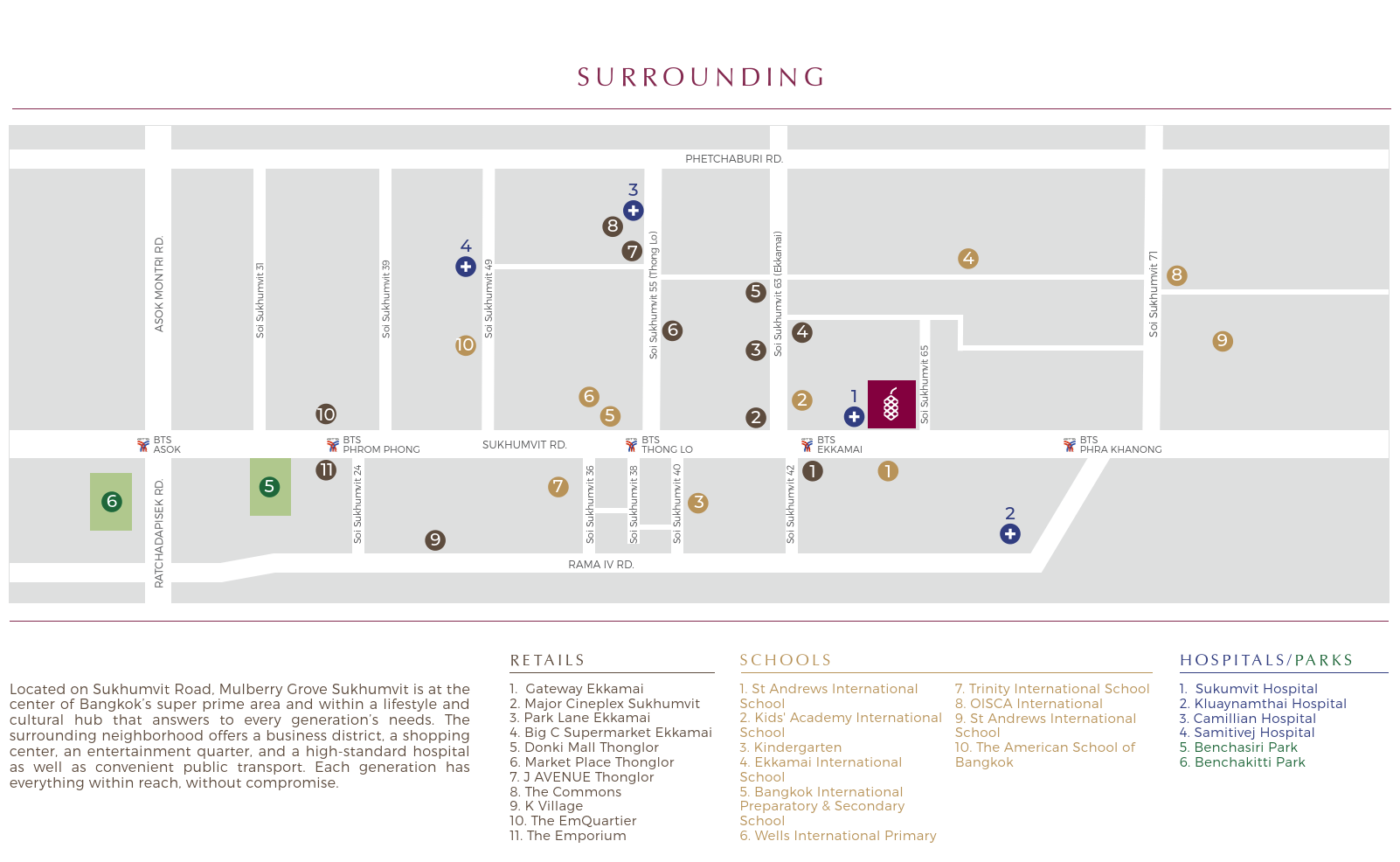 Сам комплекс Mulberry Grove Sukhumvit находится в невероятно хорошей локации с точки зрения доступа к удобствам.