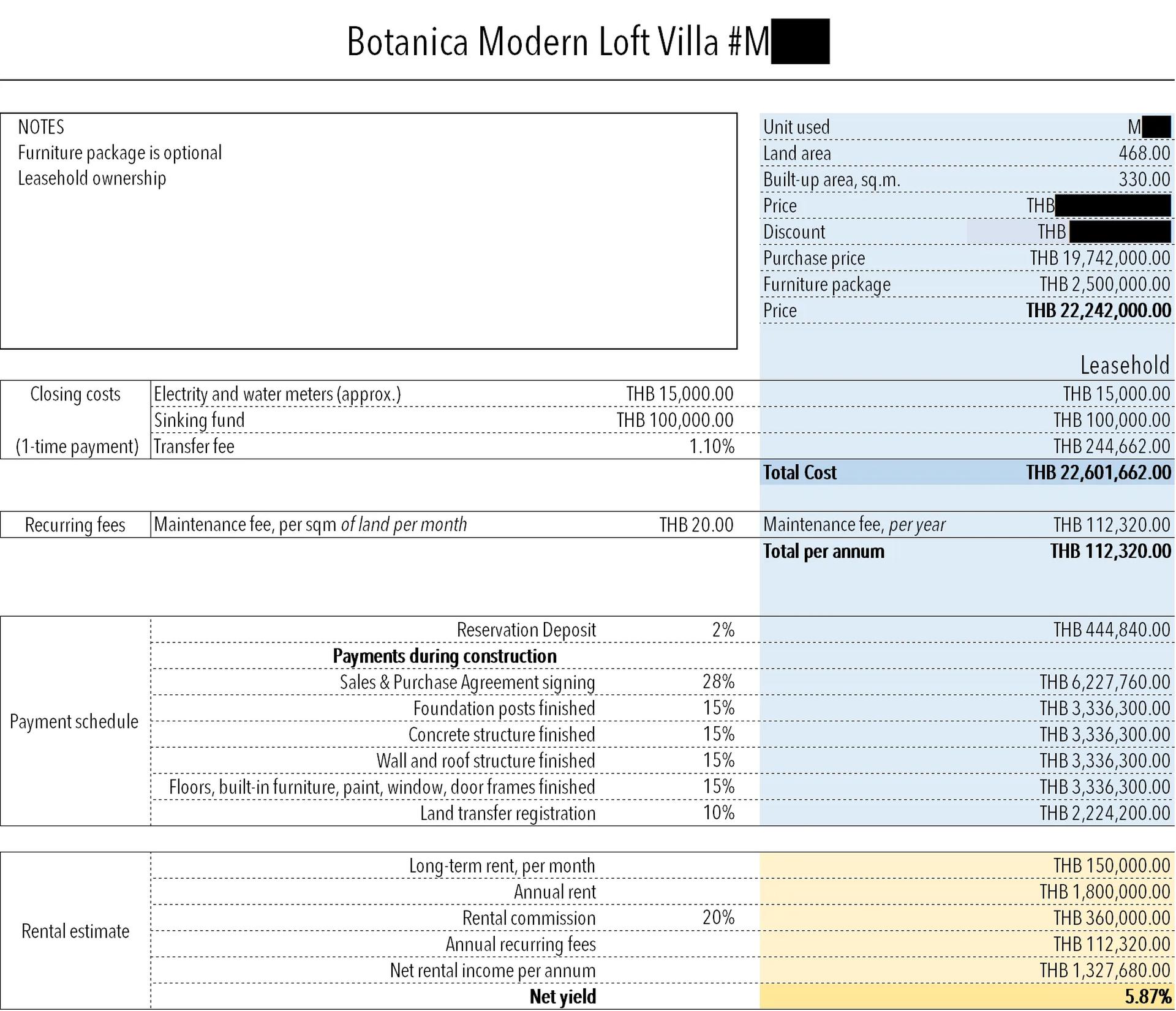Now that it’s 2024, the estimate has proven to be extremely conservative on our part. A cursory glance at open market listings shows the cheapest available villas for rent in Botanica Modern Loft starting at 250k THB per month. Off-market listings we are aware of are all well over 200k THB/month as well. Short-term rentals for high season are at least twice that rate. The villa is currently (December-January 2 months high-season contract) rented out for 550k THB/month, with several long-term contract offers lined up.