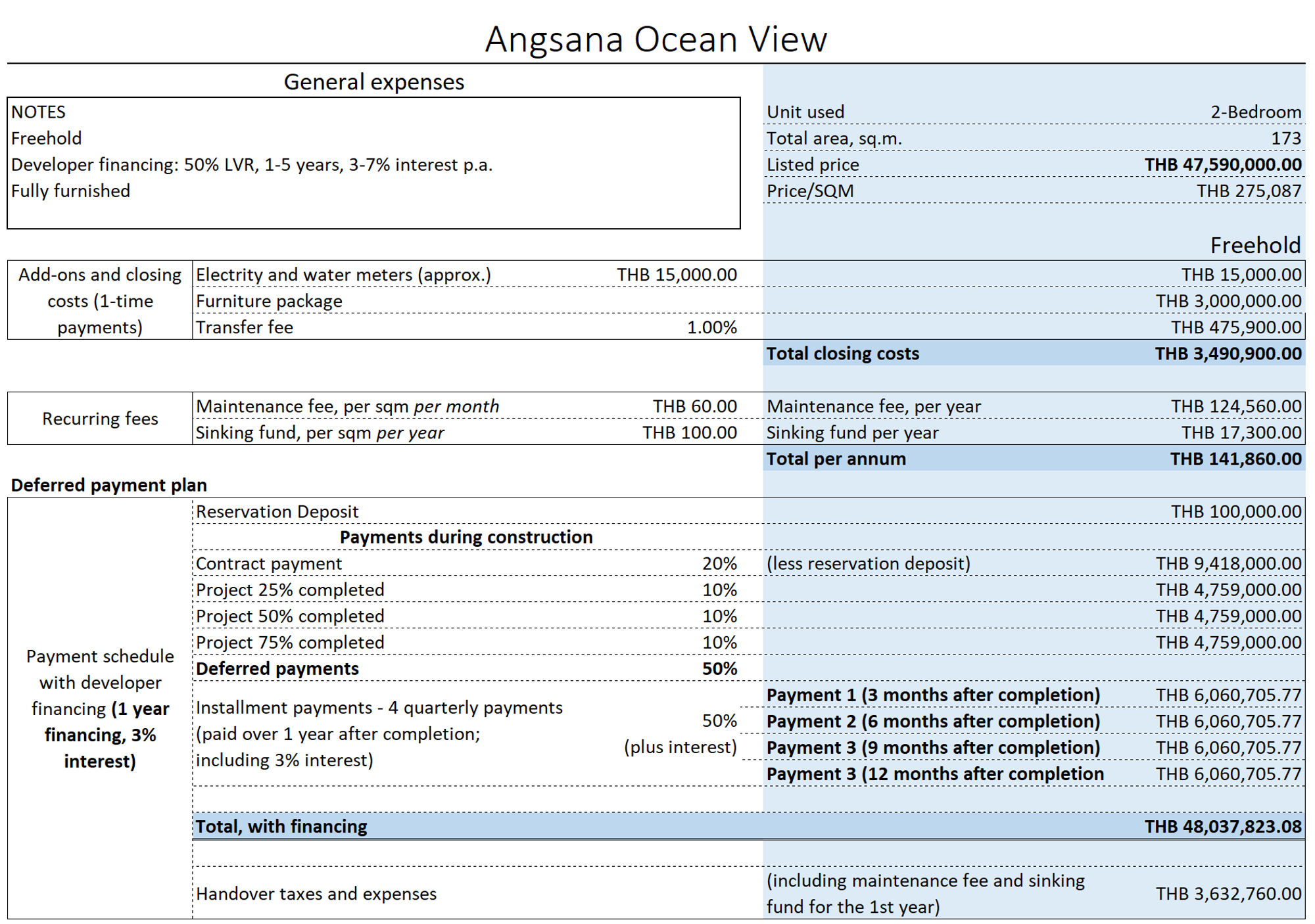 - This one actually wasn’t in the initial requirements, but was welcome by the client when offered: while Mr. A is aware that in Thailand property financing is generally not available (with some exceptions, depending on location, property type and specific development - contact us to learn more), like any savvy investor, he is interested in optimizing the payment schedule and his cash flow.