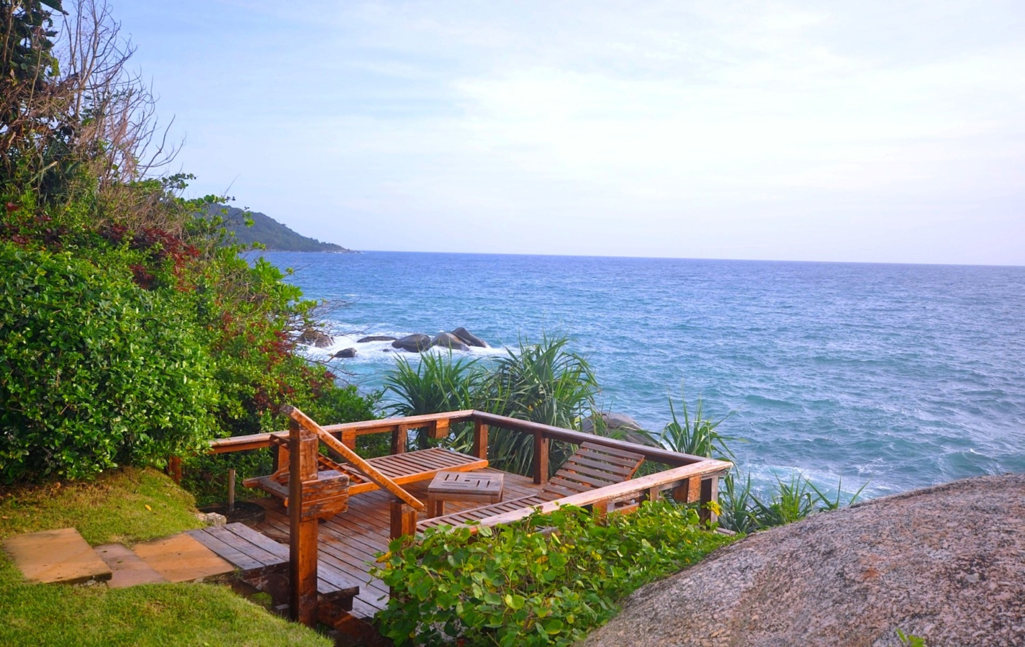 The front garden surrounded by verdant grounds stands a calm pool. Between the pool and the ocean, two leisure facilities are covered eating sala and a wooden sunbed area. Direct access to the rocks below, ideal for sunbathing, fishing, snorkeling, or swimming: a shaded sala for beachfront eating and relaxing spans over the rocks. Kata Beach is conveniently reachable across the rocks just 150 meters away.