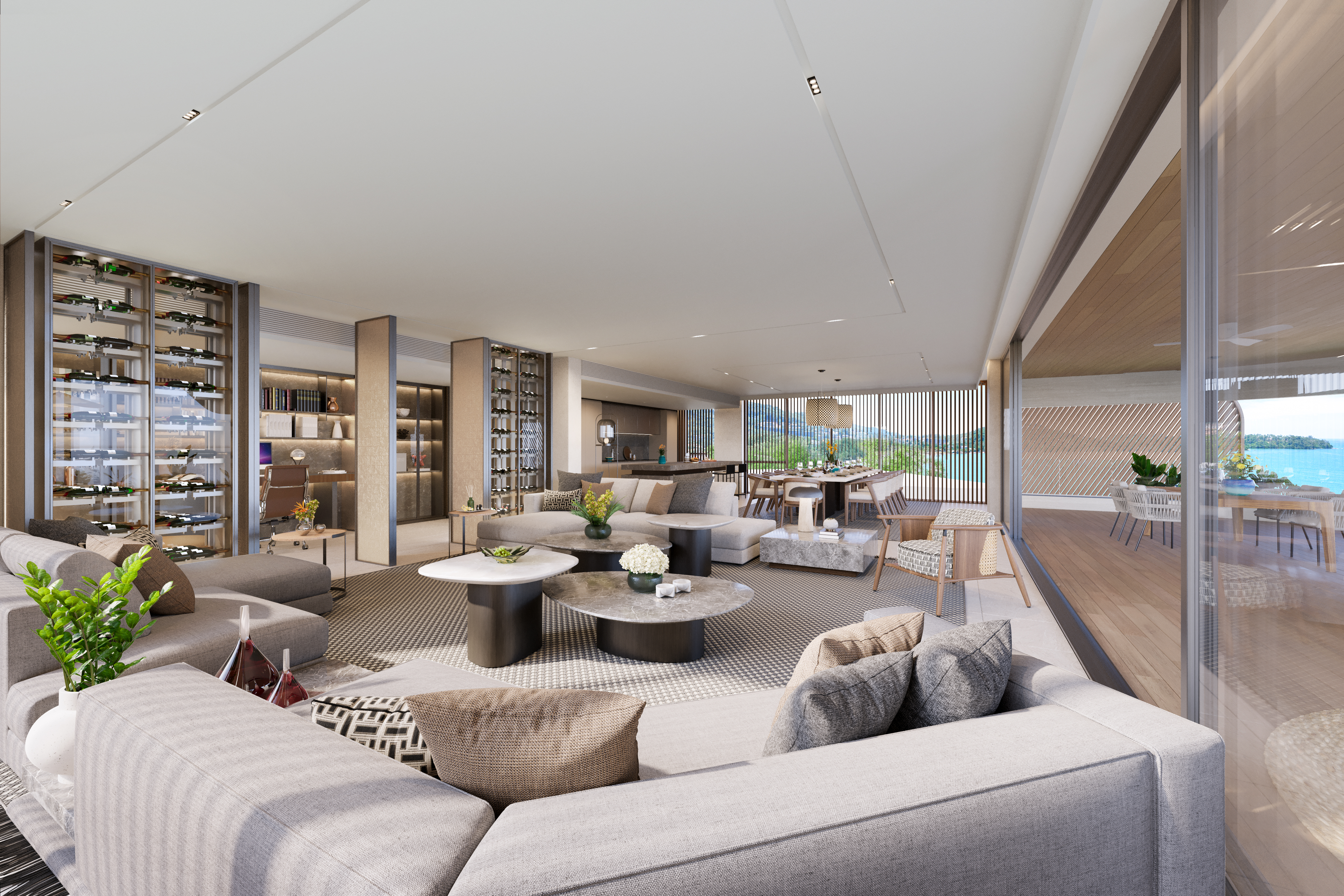 Each residence ranges from 416 sq.m to 768 sq.m, with options including ground-floor pool units, upper-level residences, and expansive penthouses. The layouts feature living rooms over 13 m wide that can open fully to verdant outdoor terraces.