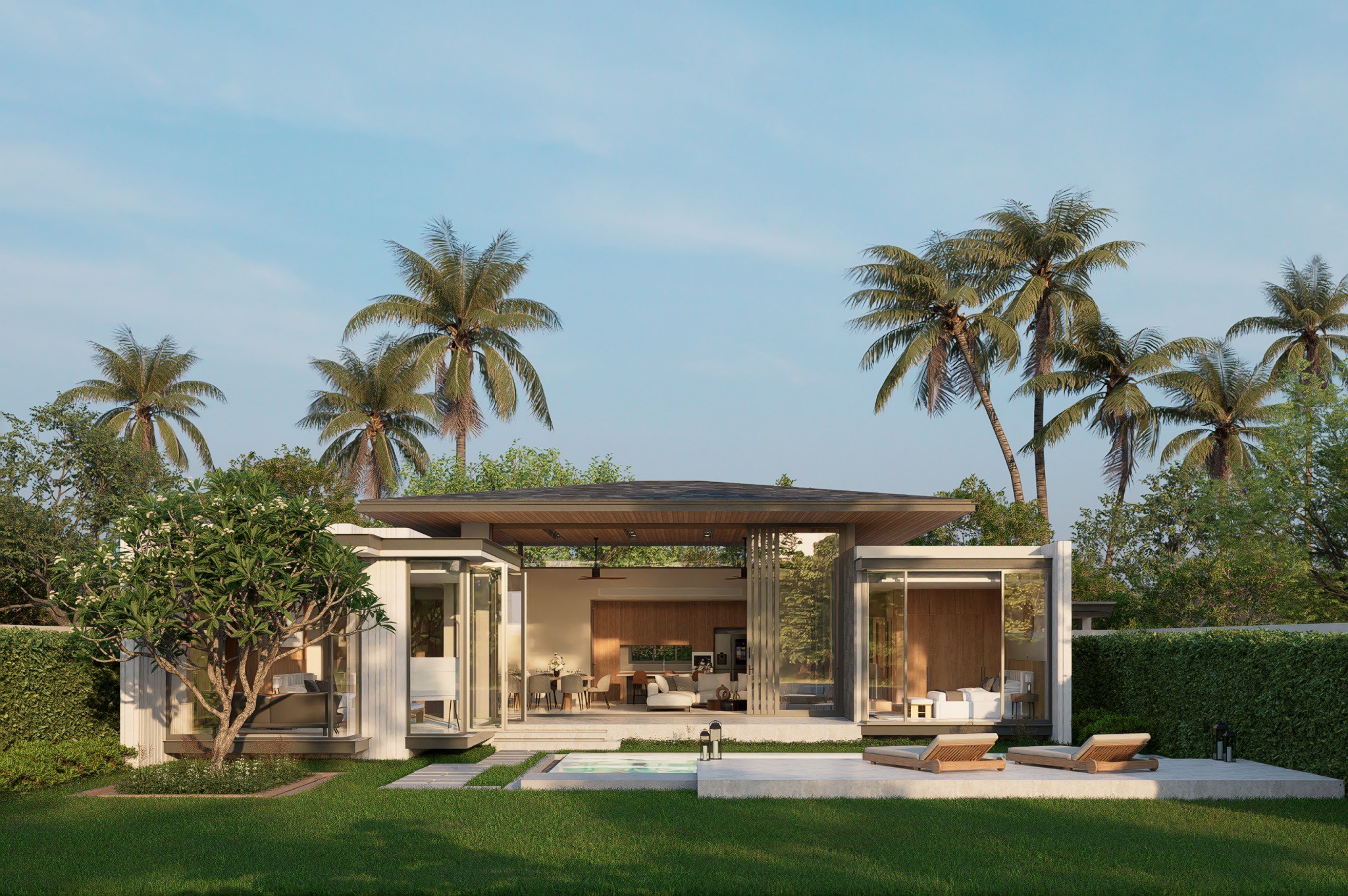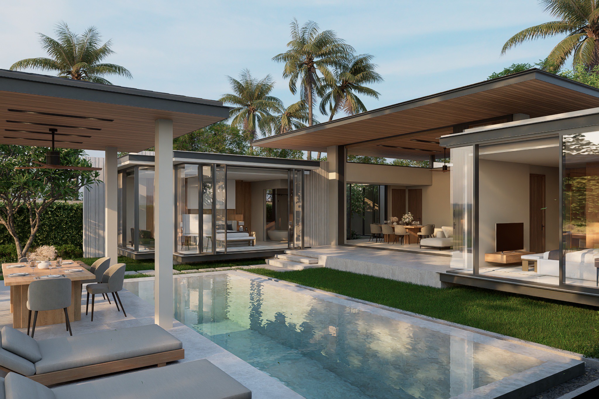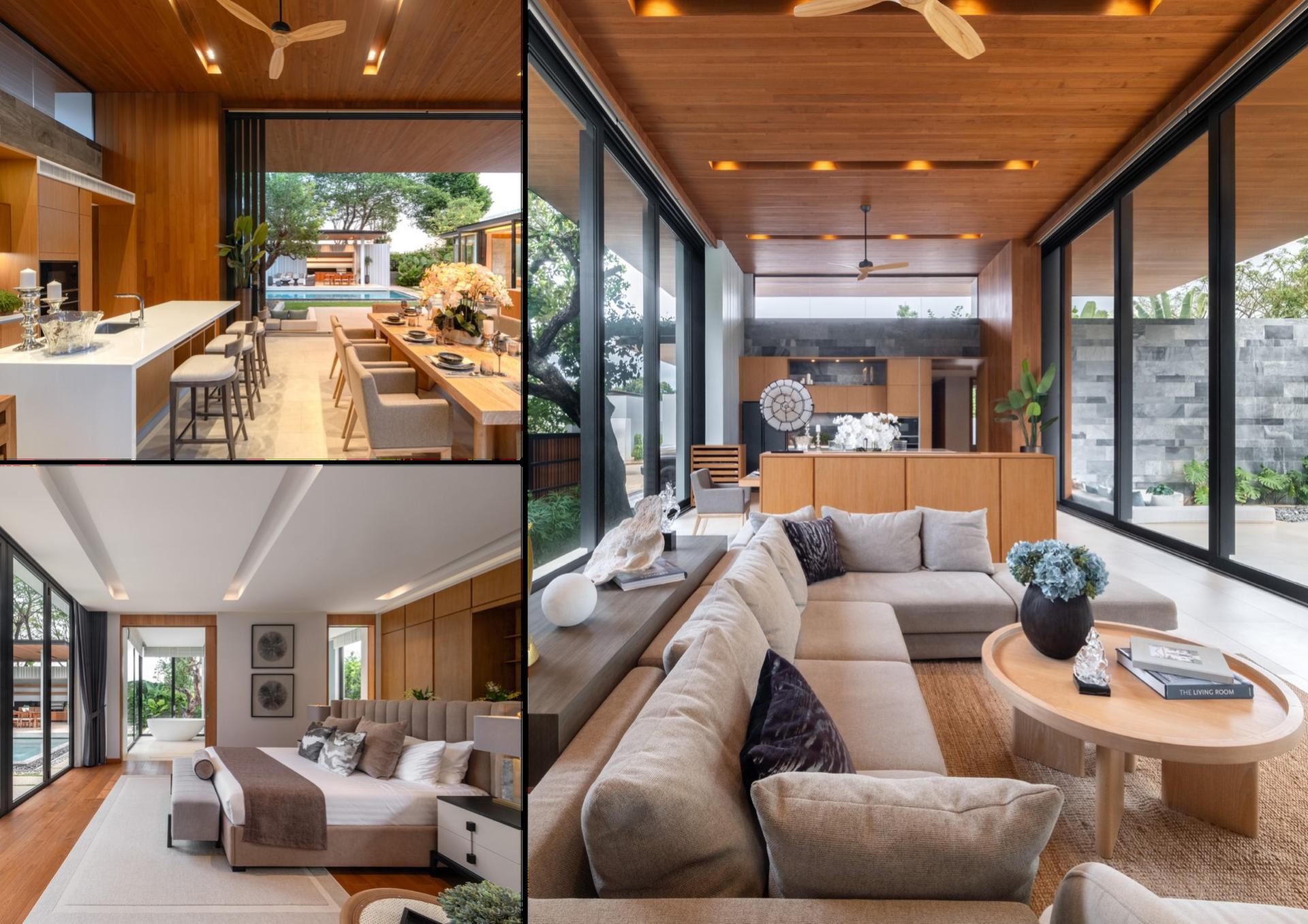 The design emphasizes modern clean lines, natural materials and natural light. The centerpiece of every villa is a striking, airy living room with extra high ceilings. Single-piece sliding glass full-height panels for walls allow to fully open up the living room, seamlessly connecting it to the pool deck and garden.