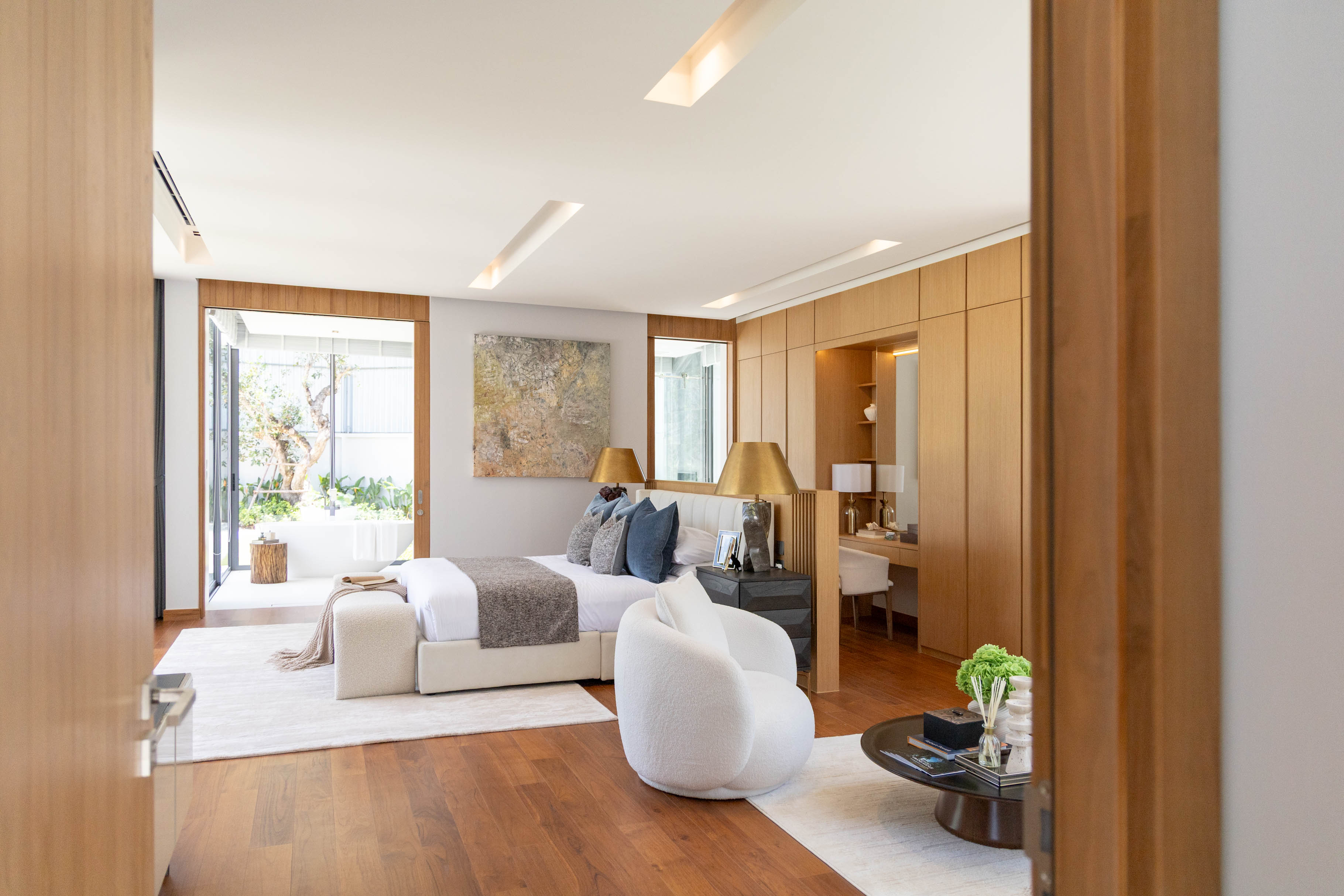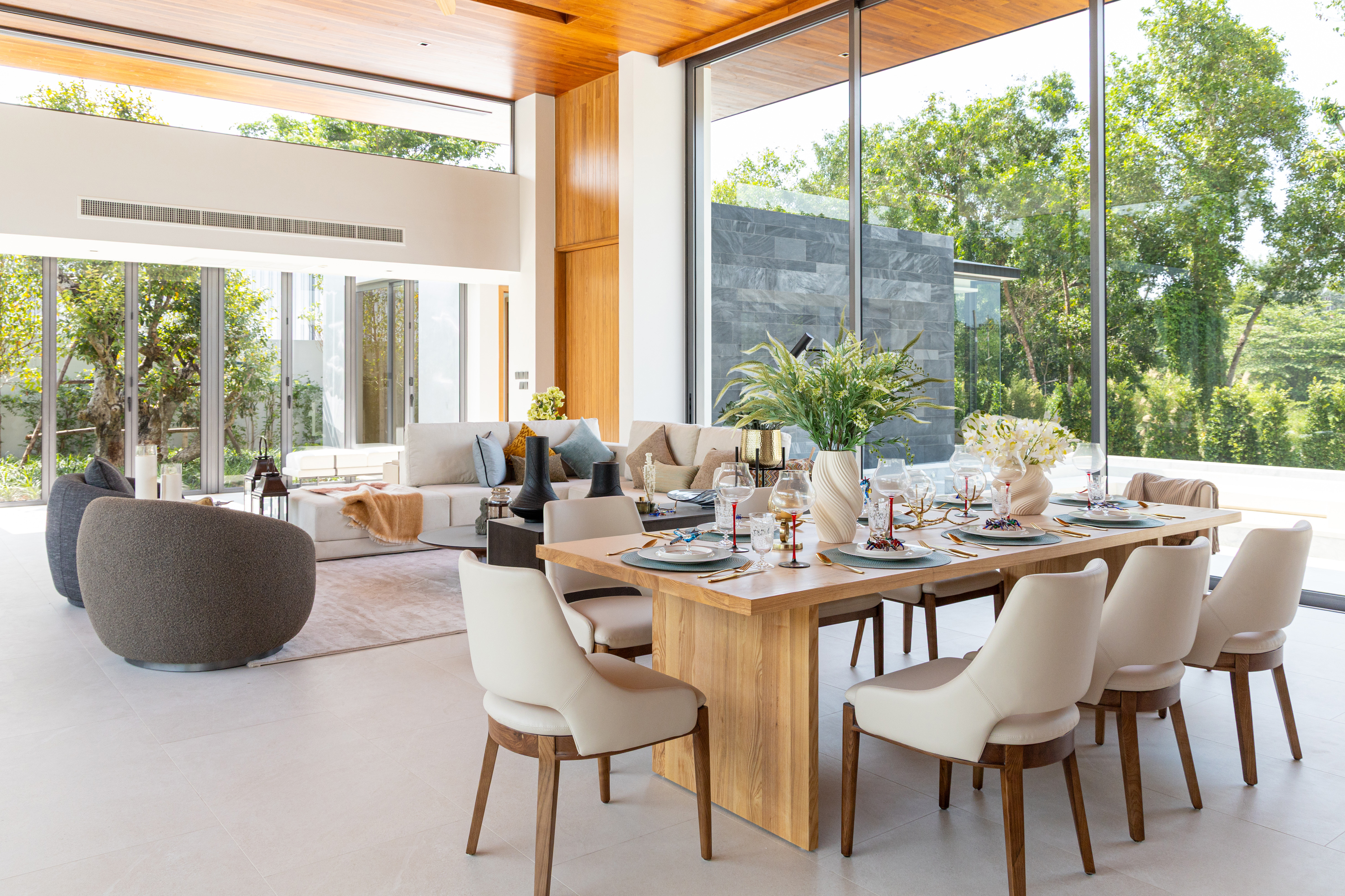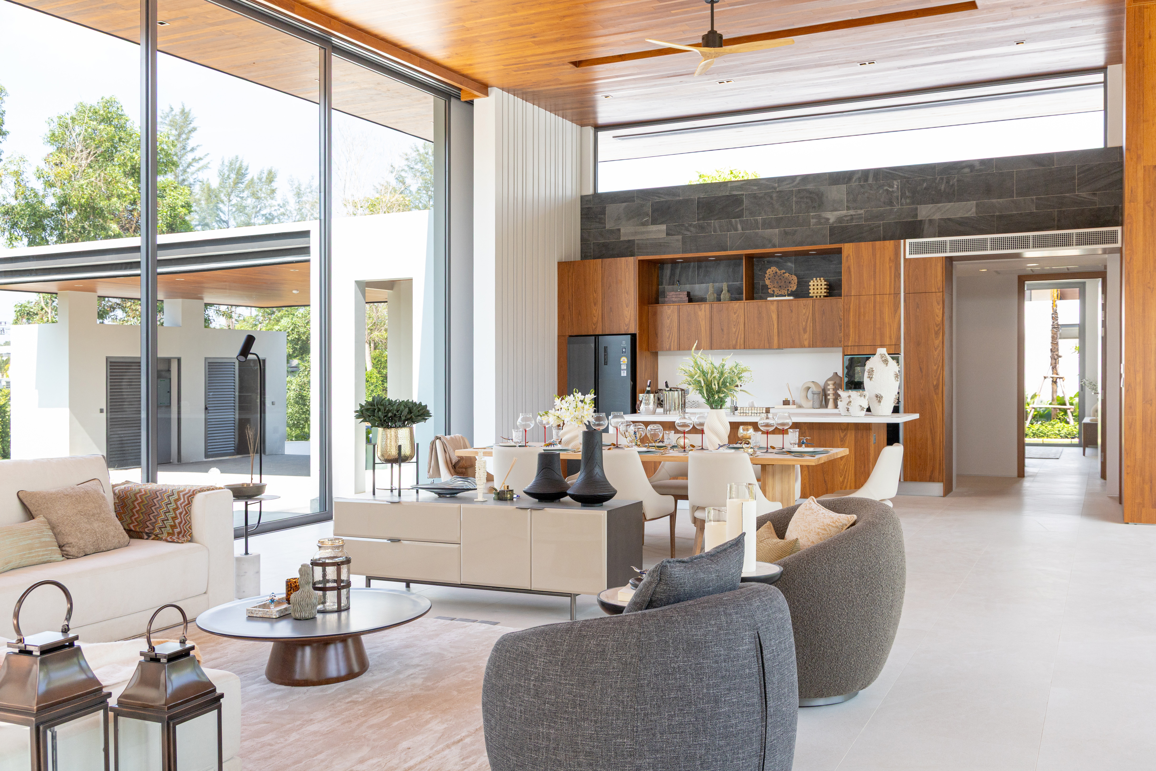 The design emphasizes modern clean lines, natural materials and natural light. The centerpiece of every villa is a striking, airy living room with extra high ceilings. Single-piece sliding glass full-height panels for walls allow to fully open up the living room, seamlessly connecting it to the pool deck and garden.