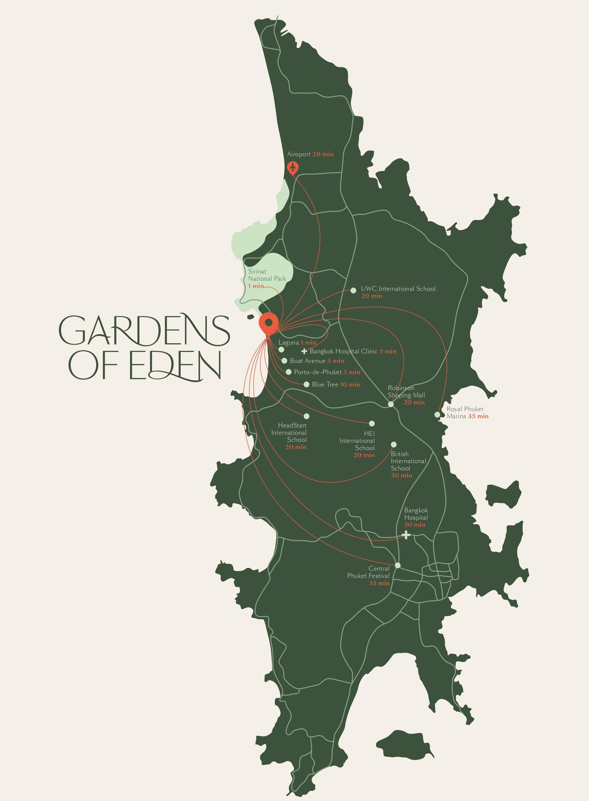 Gardens of Eden is located directly on the Layan Beach (Layan is north of Bangtao Beach; there is no clear boundary between the two, and Layan is essentially the northern half of Bangtao). All of Bangtao’s amenities are easily accessible - Boat Avenue and Porto de Phuket are just a 10-minute drive, while Laguna Phuket is right next to the project. Despite its convenience, the area remains lush and picturesque, featuring a beautiful beach and breathtaking sunset views.