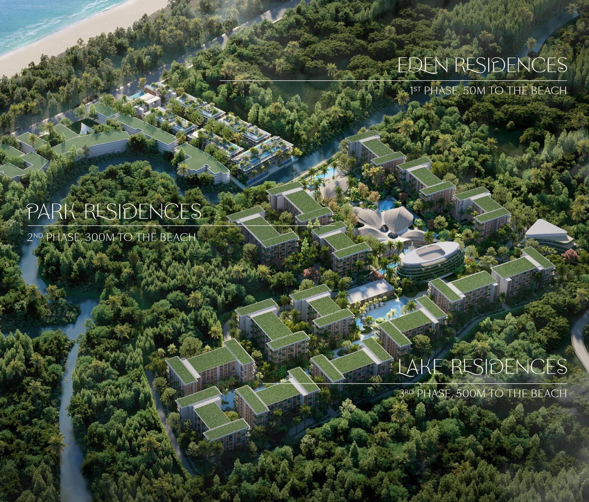 Gardens of Eden is a new mixed-use development located on the beachfront of Layan Beach. This large-scale, multi-phase project includes ultraluxury Eden Residences, as well as Park Residences and Lake Residences — 7-story condominiums positioned at the rear of the project, beyond a small waterway.