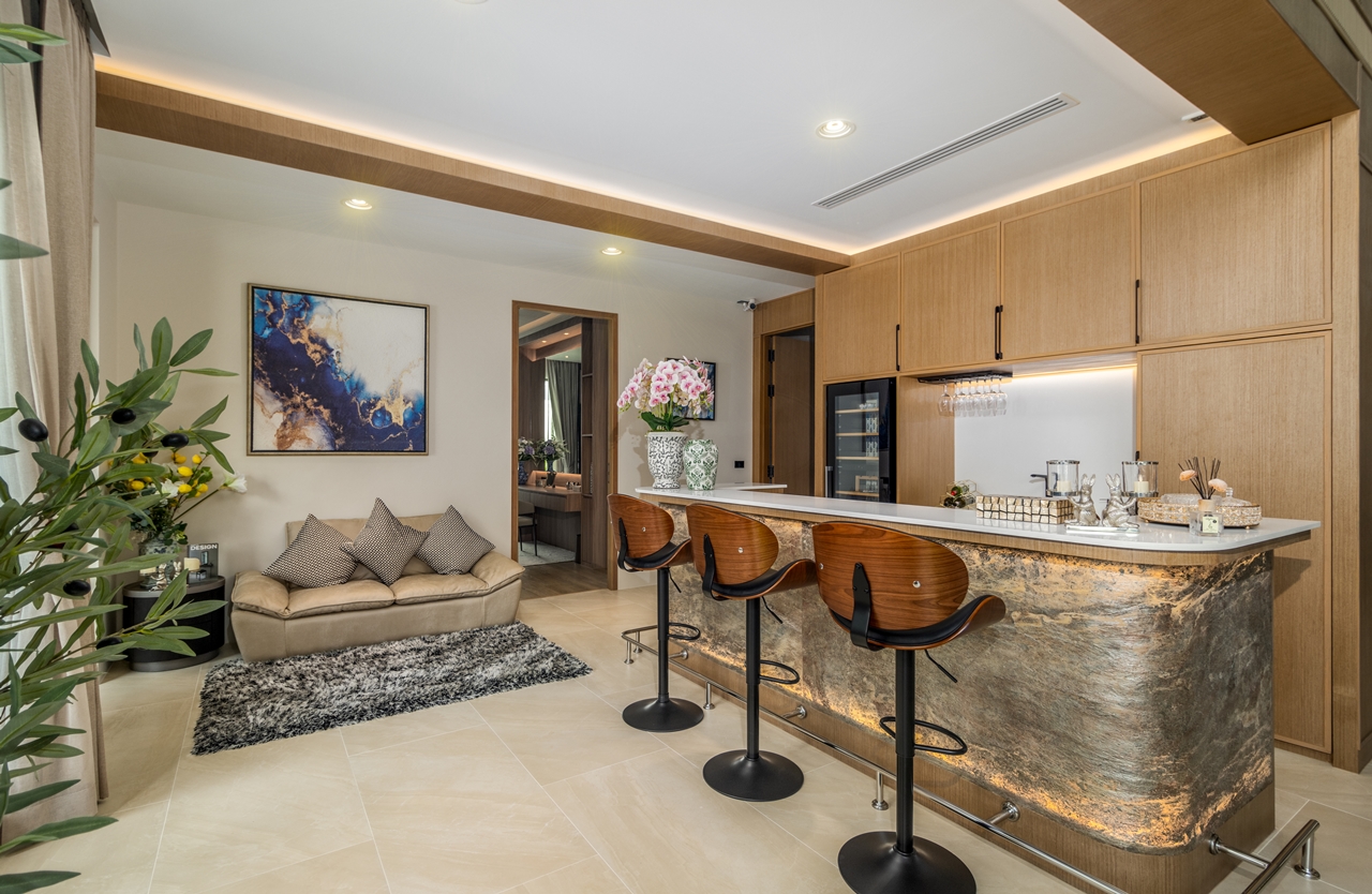 The interiors showcase intricate Ayutthaya-style wooden motifs of four-leaf lotus groves throughout, creating elegant and calming atmosphere. Traditional design is paired with modern convenience, including premium fixtures, high-end appliances, and quality wood finishes.