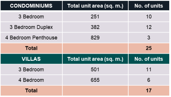 That includes a total of 17 three- and four-bedroom villas, and 25 three- and four-bedroom single-story, duplex and penthouse condominiums. Villas range in size from 501 to 655 sq. m., and condominiums from 251 to 829 sq. m. All villas and condominiums feature a private pool.