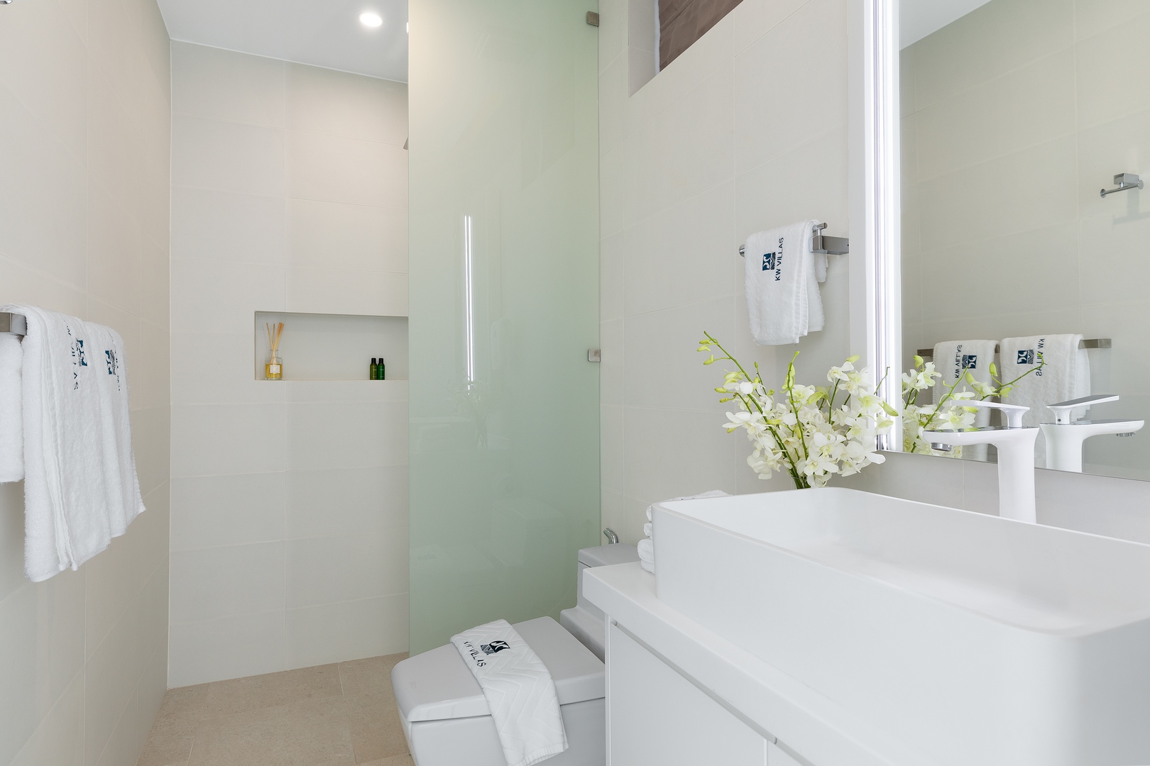 Moving up to the middle floor, you'll find an open-plan kitchen, dining, and living area that seamlessly connects to an outdoor terrace featuring a swimming pool and a sunken seated sala. Additionally, this floor houses one guest toilet and two bedrooms, each with its own en-suite bathroom, positioned on opposite sides of the villa.