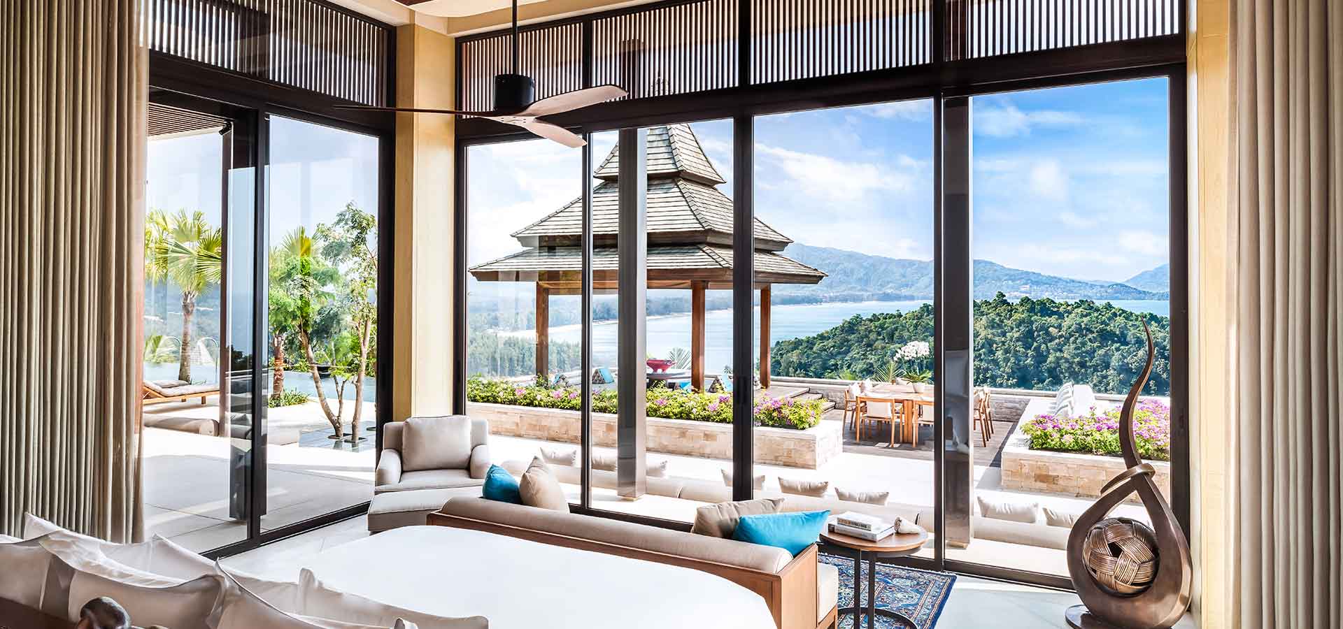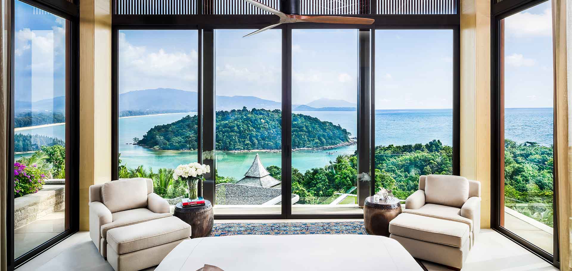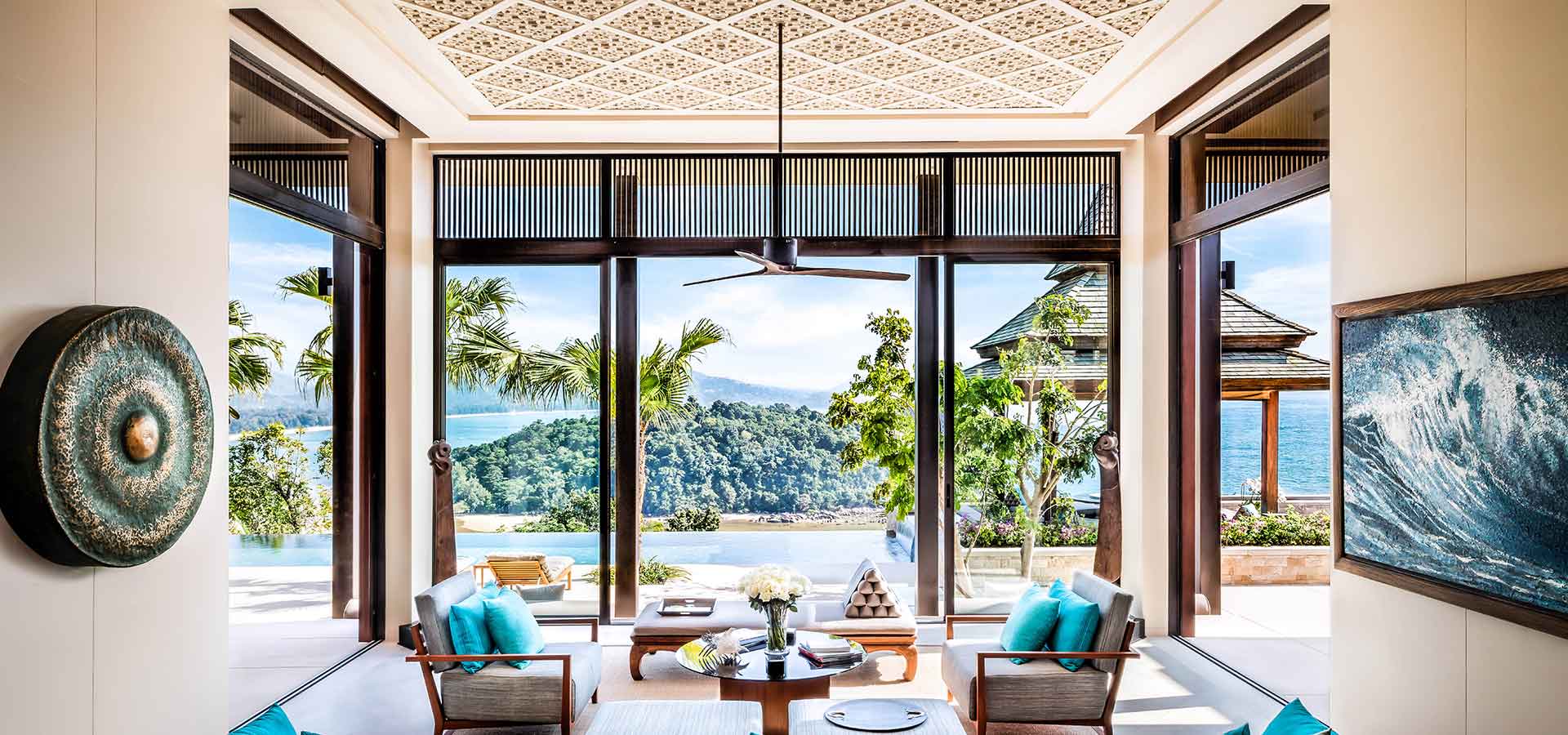 Gorgeous 180 degree Andaman sea views are further augmented by high, intricately carved ceilings and expansive floor-to-ceiling glass windows.