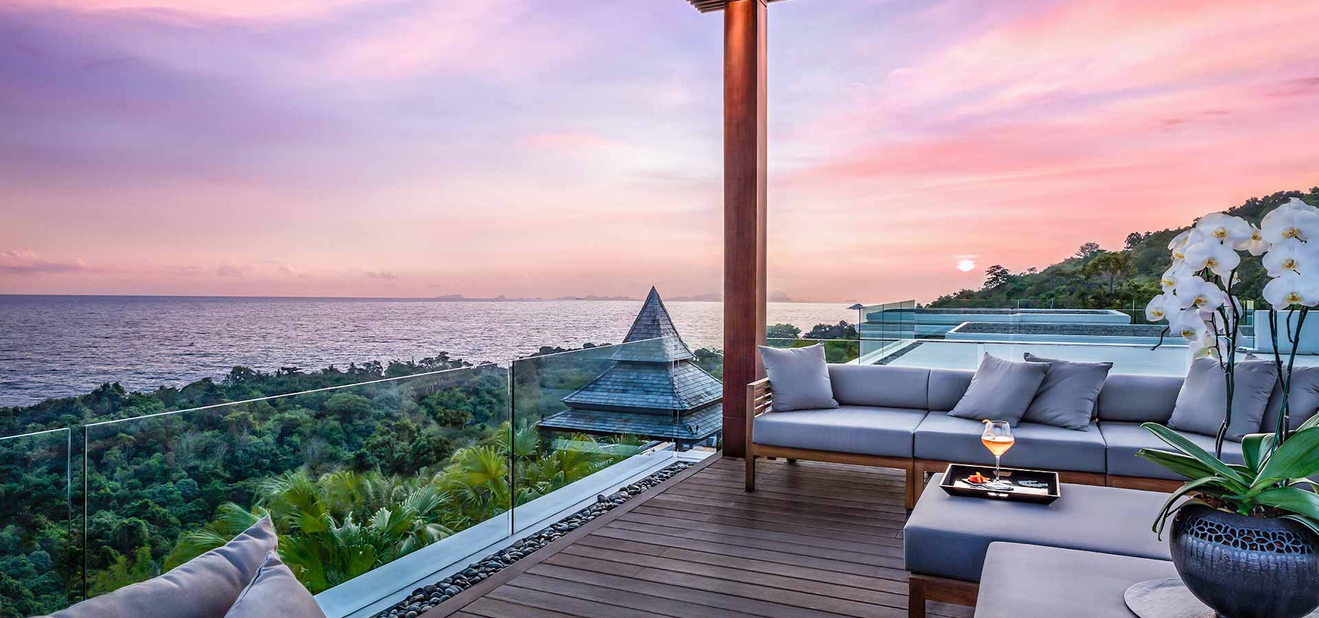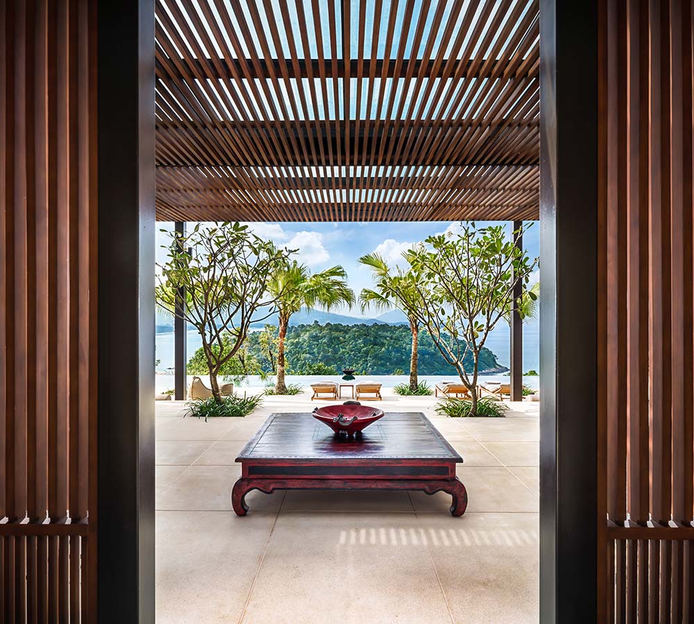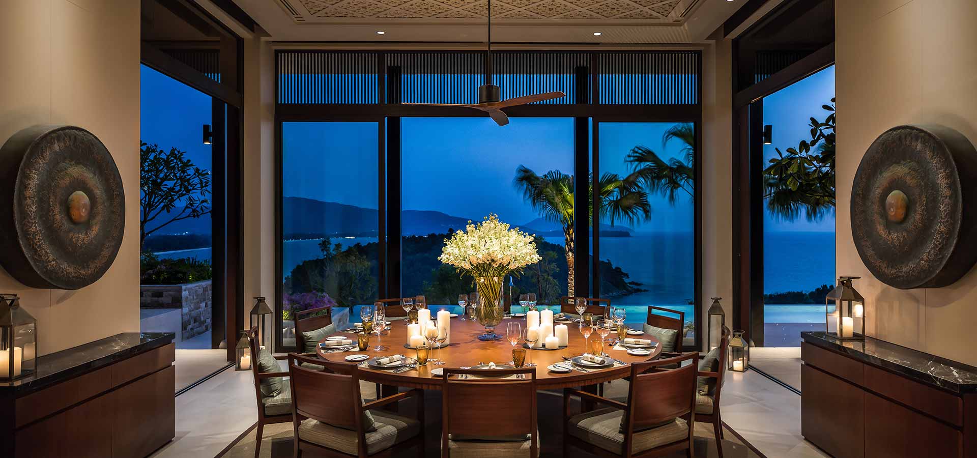 Gorgeous 180 degree Andaman sea views are further augmented by high, intricately carved ceilings and expansive floor-to-ceiling glass windows.