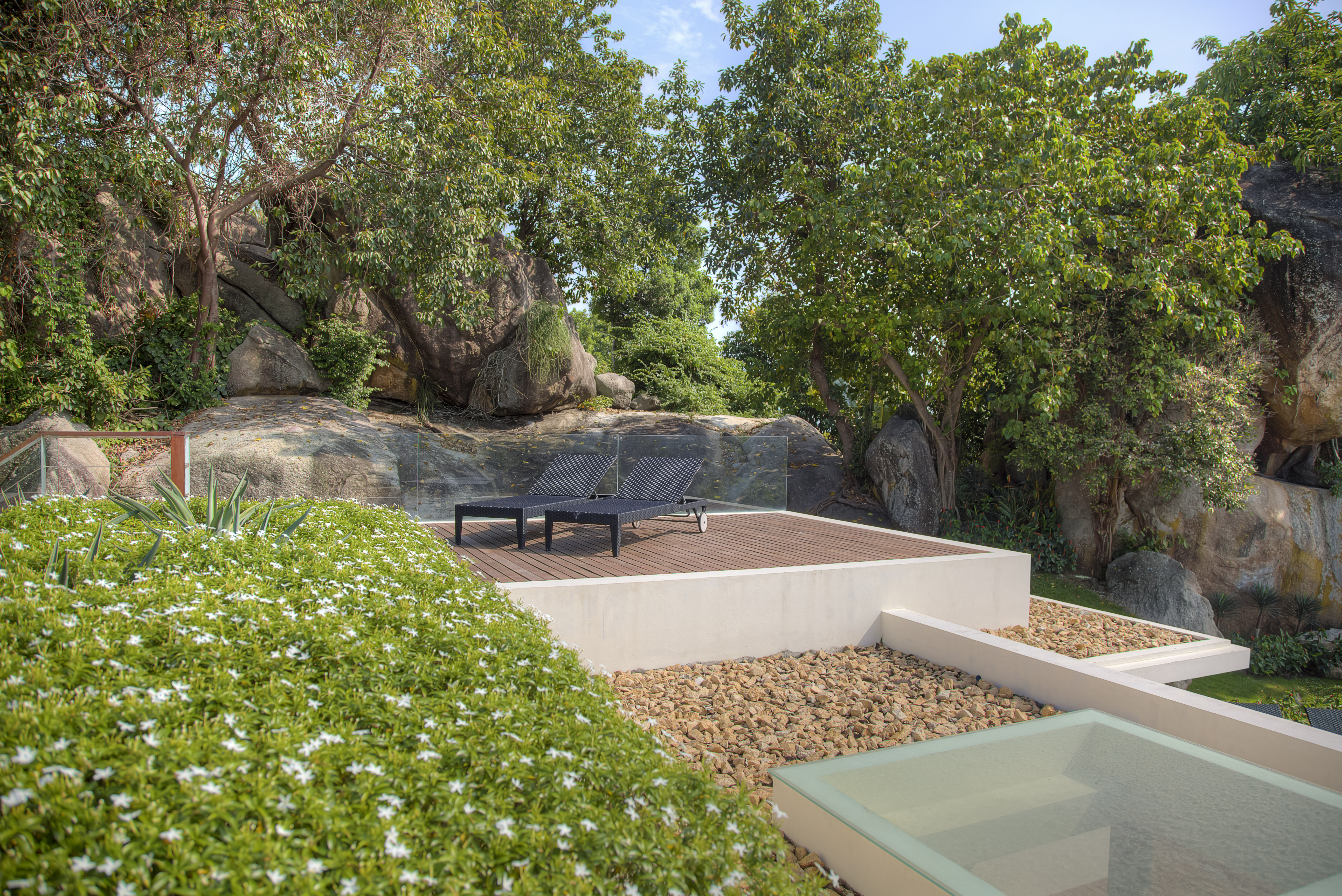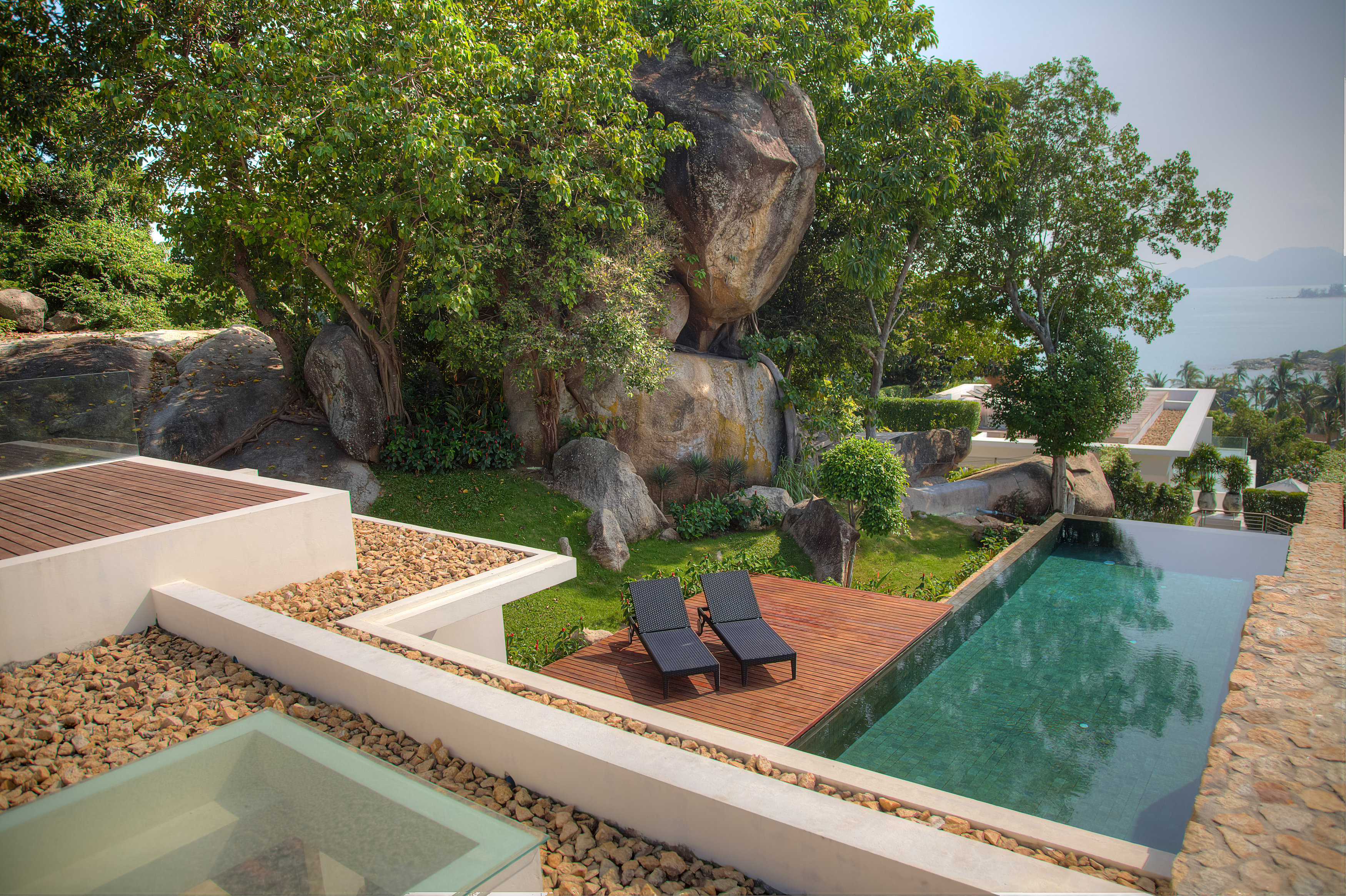The estate is designed by Award-winning designer, Gary Fell of GFAB Architects. He designed for the villas to reflect the natural topography and elevation as well as incorporating mature tropical trees and rock formations into each villa