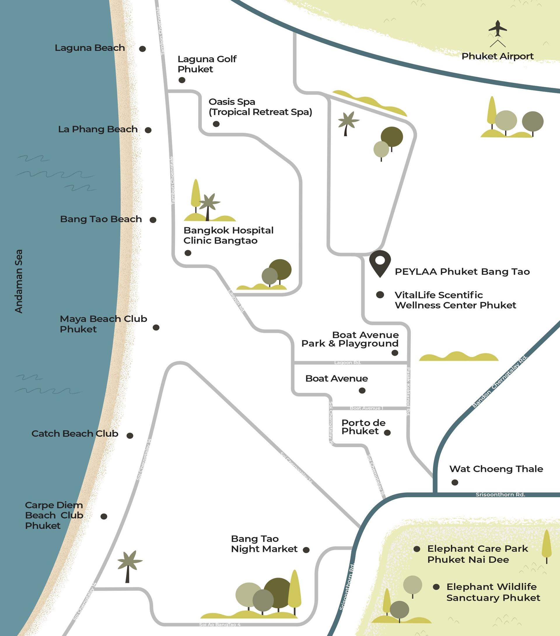 Peylaa is located in Bangtao area - Phuket’s main hotspot of 2020s. It’s just 1300 m to the entrance to Laguna Phuket - integrated resort area by Banyan Tree Group. Boat Avenue shopping and dining district is 1000 m away, Porto de Phuket lifestyle mall is in 1500 m. The road the project stands on is actively developing, mainly due to new phases of Boat Avenue: Boat Avenue Park and Playground - a new extension catering to families with kids - starts in just 350 m. Another extension next to it - Boat Avenue Galleria - is underway.