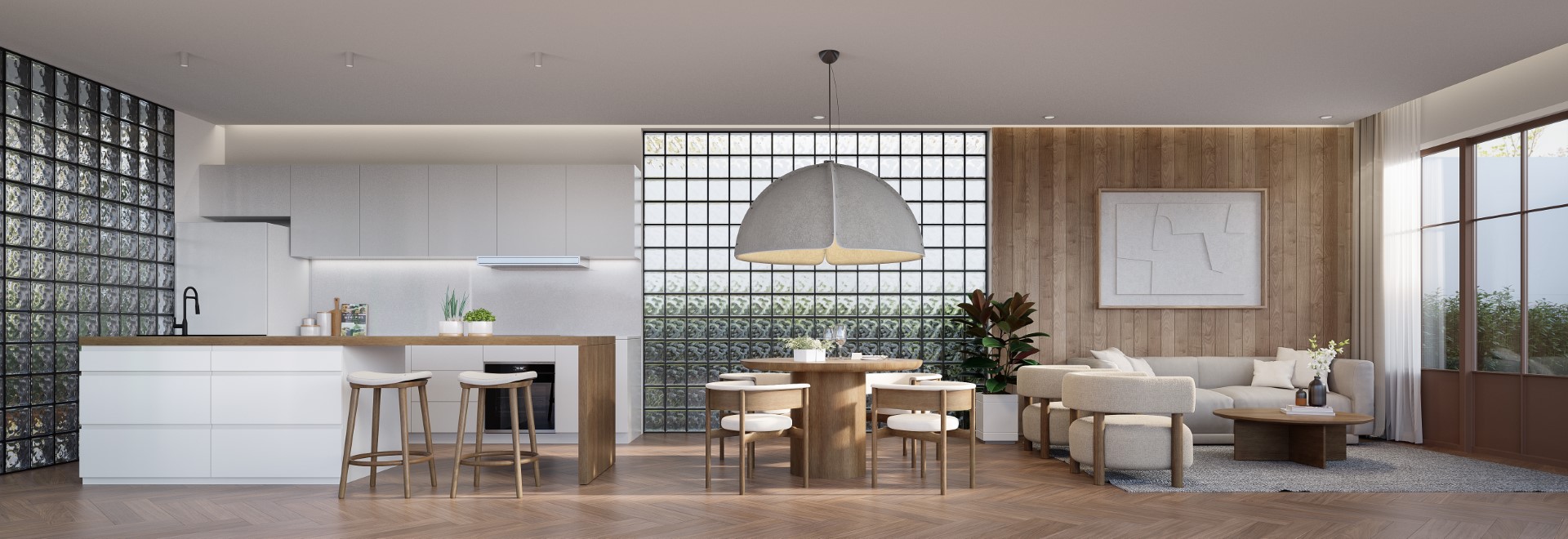 The villas feature clean and understated modern Japanese design (similar to the one we’ve seen in the developer’s Mono villa lineup before), with a bit of mid-century modern. The latter is at its most prominent in glass-block walls, that let in soft natural light without compromising privacy.