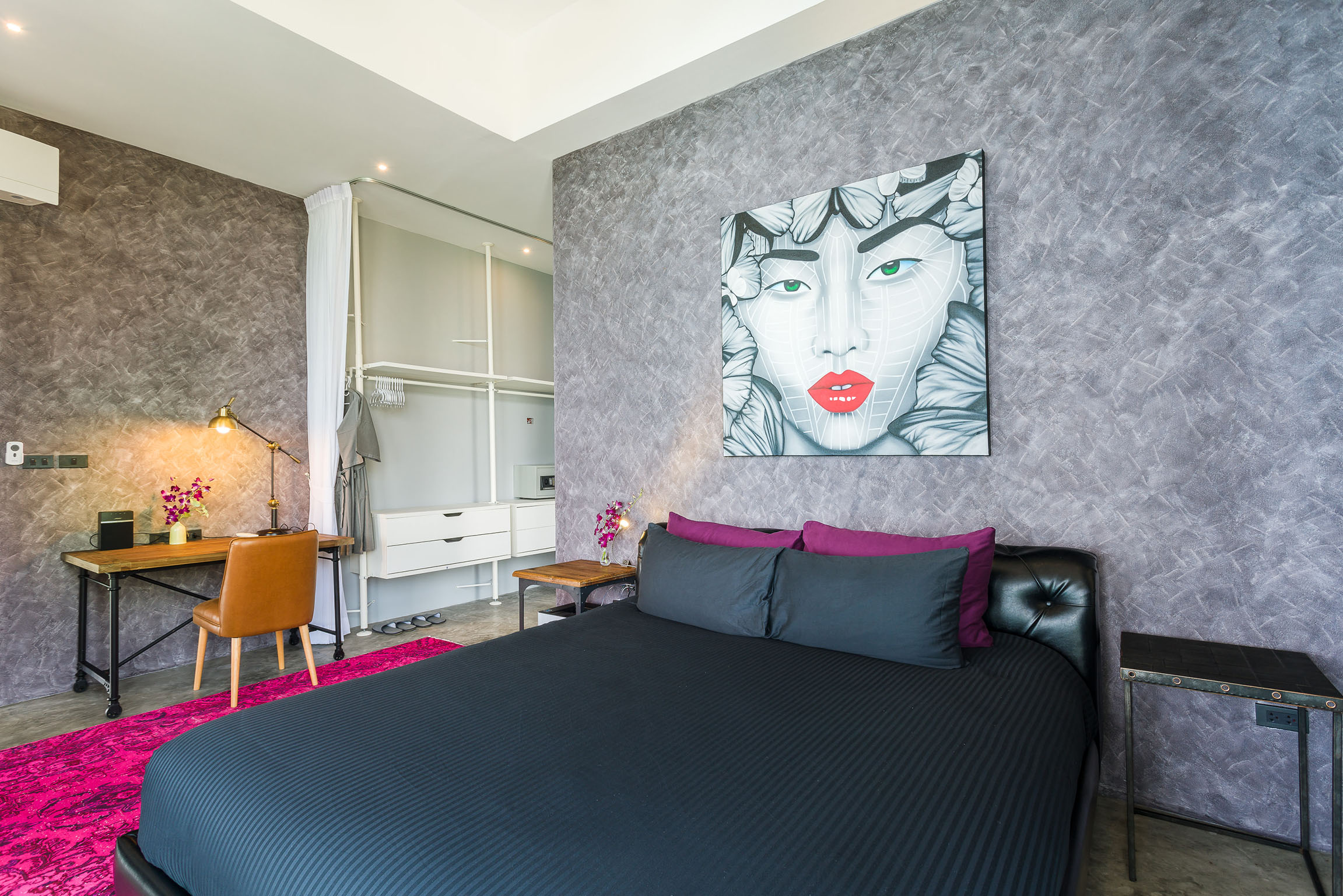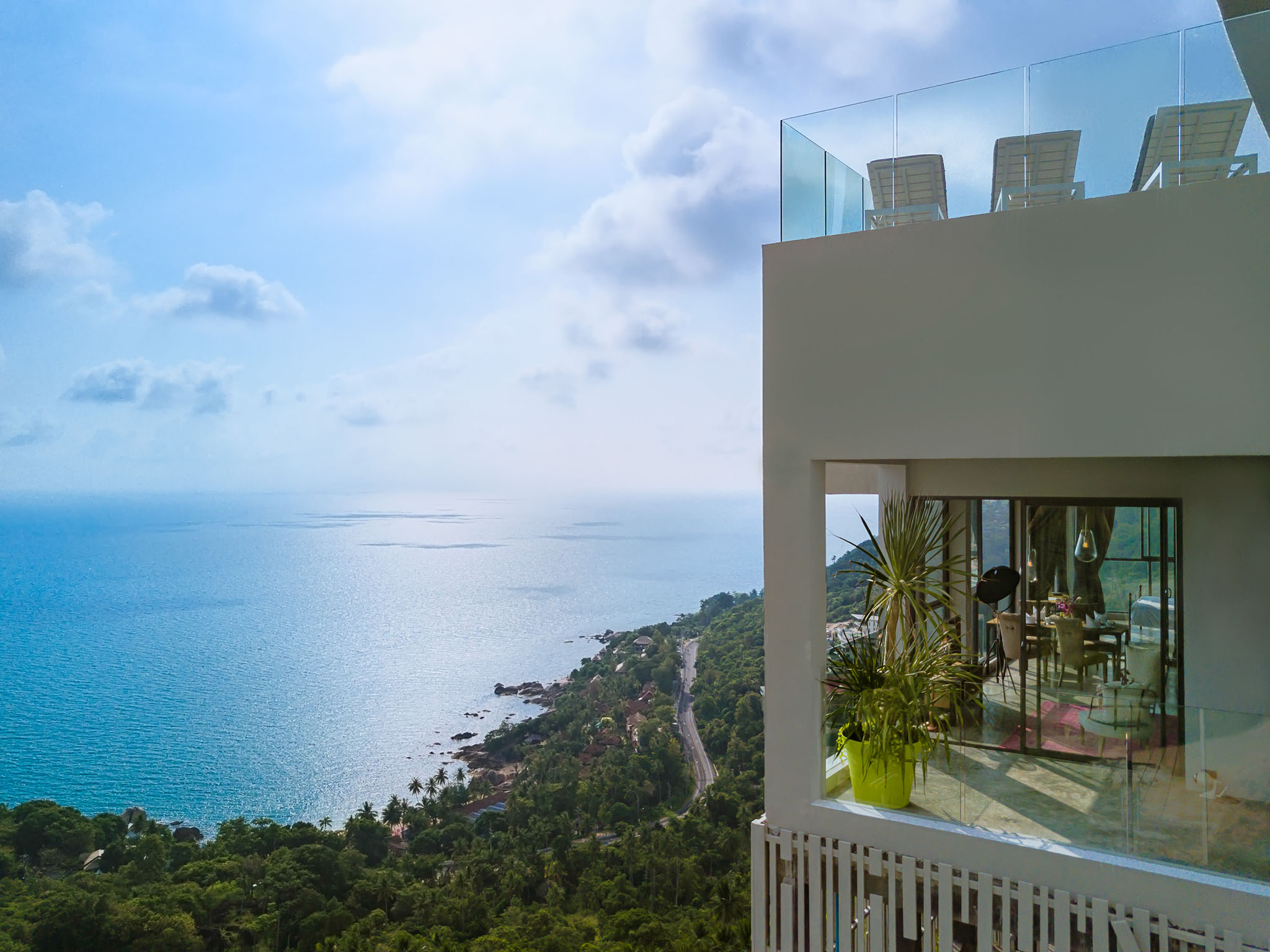 The exquisite self-contained apartment is located under the main building and also offers the unforgettable 180 degree panorama view at a height of 160 meters thanks to the full glazing. Even if the unique interior is different from the style of the villa, it also harmoniously fits into the overall picture. On 120 sqm you will find an open loft apartment with two separate bedrooms. Each bedroom has a shower-bathroom, walk-in closet and a comfortable king or queen-size bed. The feel-good factor in the living area with adjoining balcony is not missing anything: the designer day-sofa invites you to relax in front of the Internet-TV as well as the seating furniture on the balcony. The fully-equipped private kitchen with top view over Coral Cove to Chaweng does not limit your creativity - but you can also use the service of the Sky Dream Villa team. The Sky Loft is very lovingly decorated with vintage design furniture from across Asia and Europe.