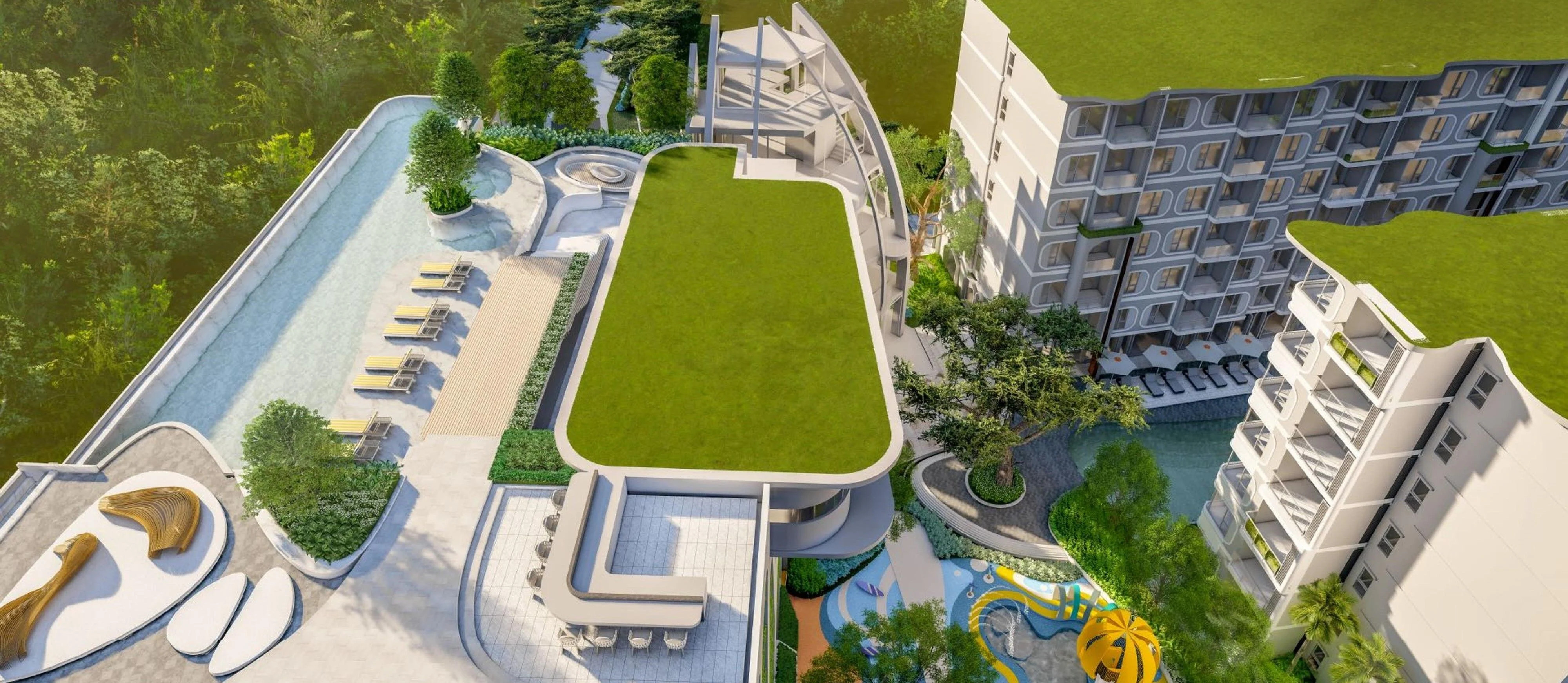 The development consists 6 residential buildings, seven stories each, sitting on ~13.3 Rai (22,053 sqm) - like we said, a lot of space for greenery and facilities. Between the buildings lies a network of swimming pools, water features, sun decks and garden areas.