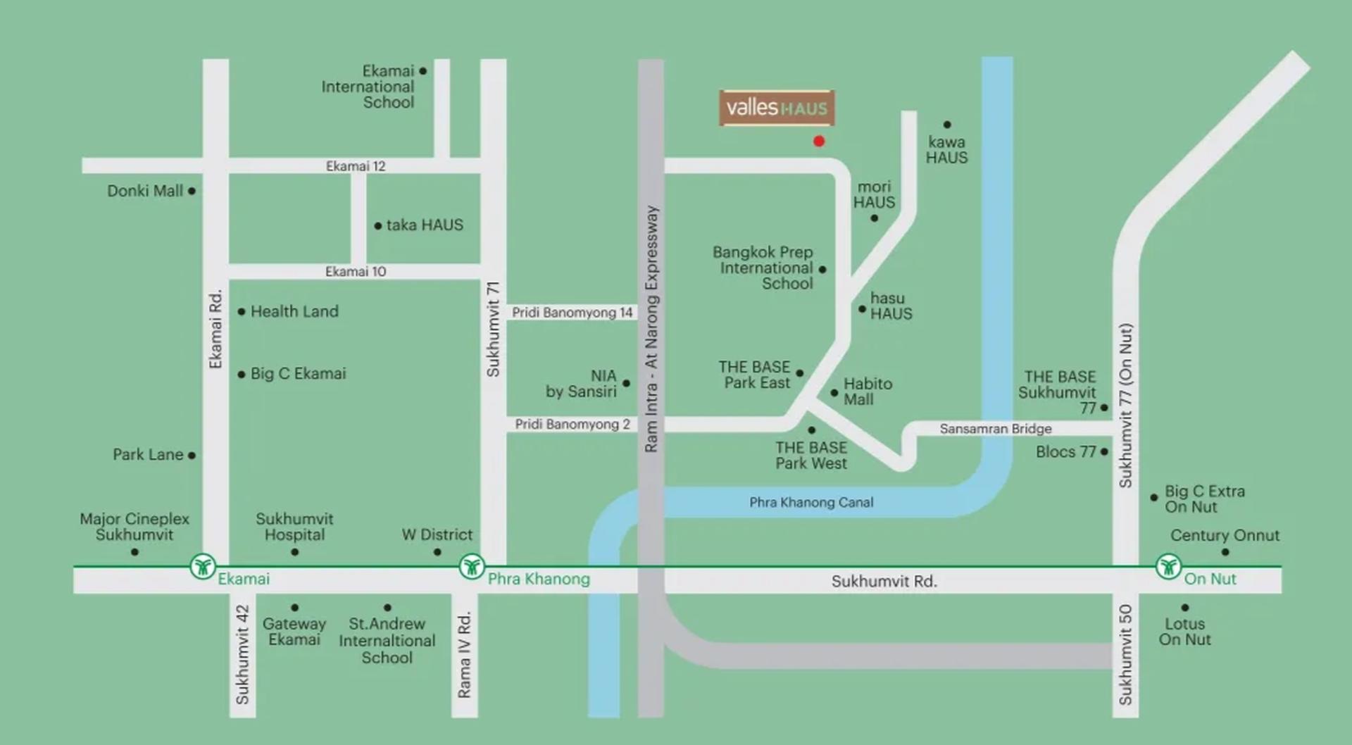 Valles HAUS is situated within the T77 Community and in a central subdistrict of Bangkok. The area offers strong connectivity, with both BTS Phra Khanong and BTS On Nut within walking distance, while also providing convenient entry to the Ram Intra–Atnarong Expressway for travel across Bangkok.