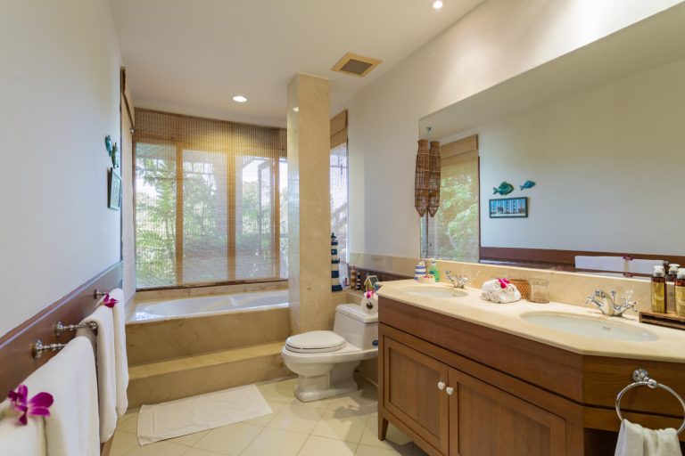 The expansive master bedroom welcomes you with a king-size four-poster bed set in luxury linens, a private office room, and a large en-suite bathroom with a sunken bathtub. Floor to ceiling windows provide continuous views of the infinite pool and the unceasing ocean beyond.