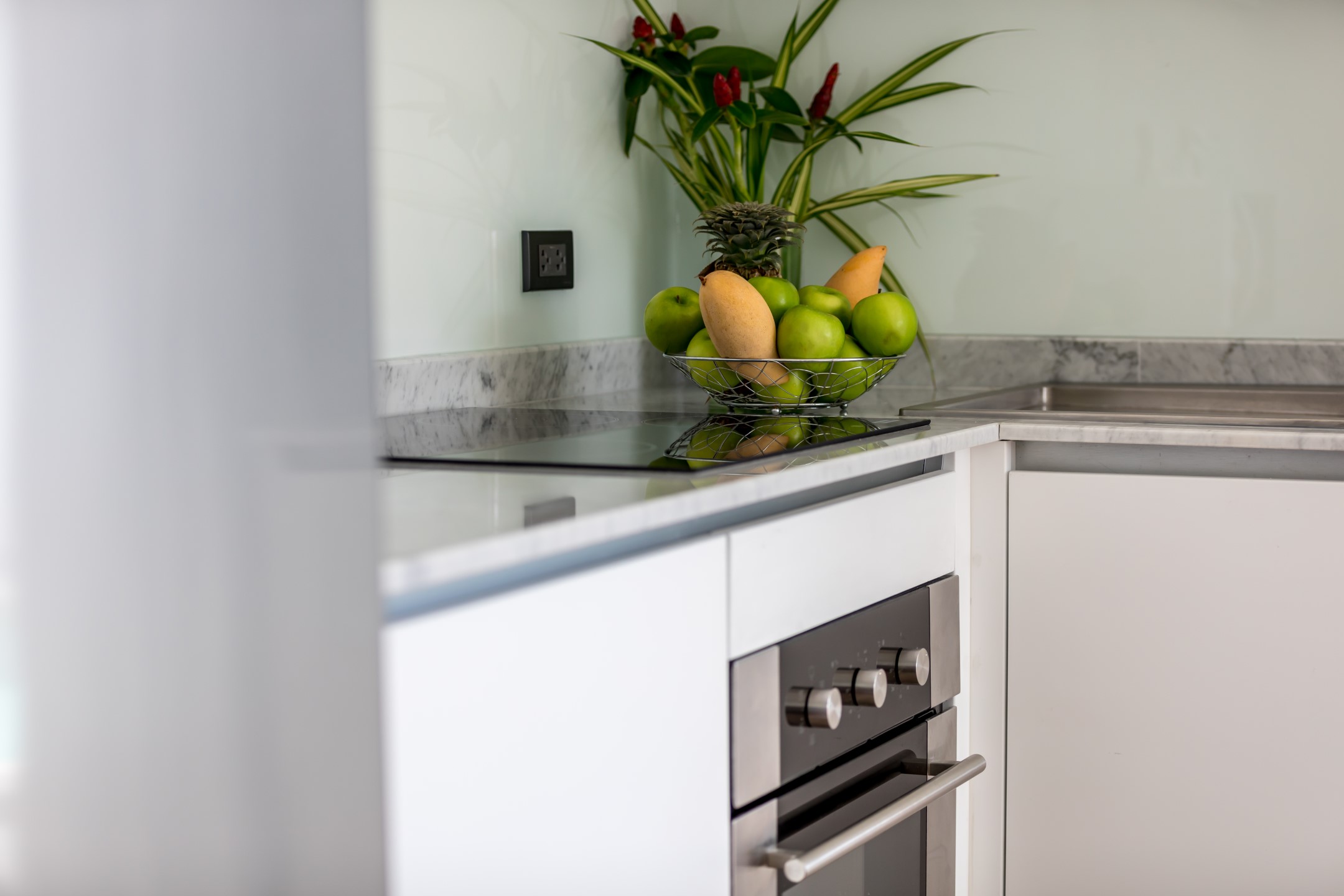 The villa is configured in a Balinese style consisting of two pavilions separated by an 8m swimming pool. One pavilion consists of an open plan living space with European style kitchen and a pantry room with washing machine. The kitchen is fully equipped with dishwasher, oven, and a 4 ring electric stove top. As well as a comfortable dining table there is a large sofa and 55 inch Smart TV.