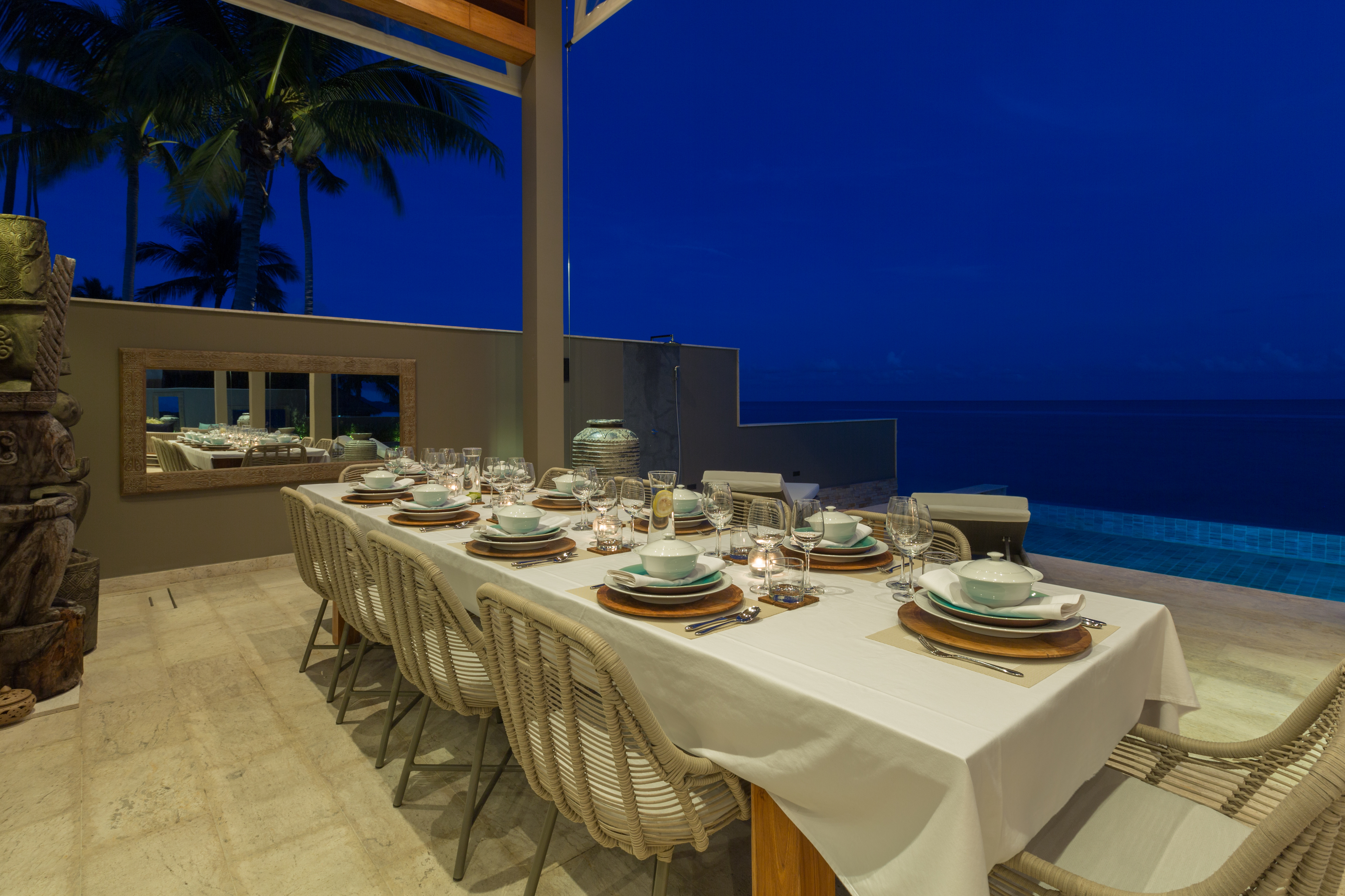 Outdoor amenities include a separate swimming pool for kids, a larger infinity pool, and a shower. There is also a bar in the open air with a thoughtfully equipped dining area for you to enjoy the sunset while having dinner.