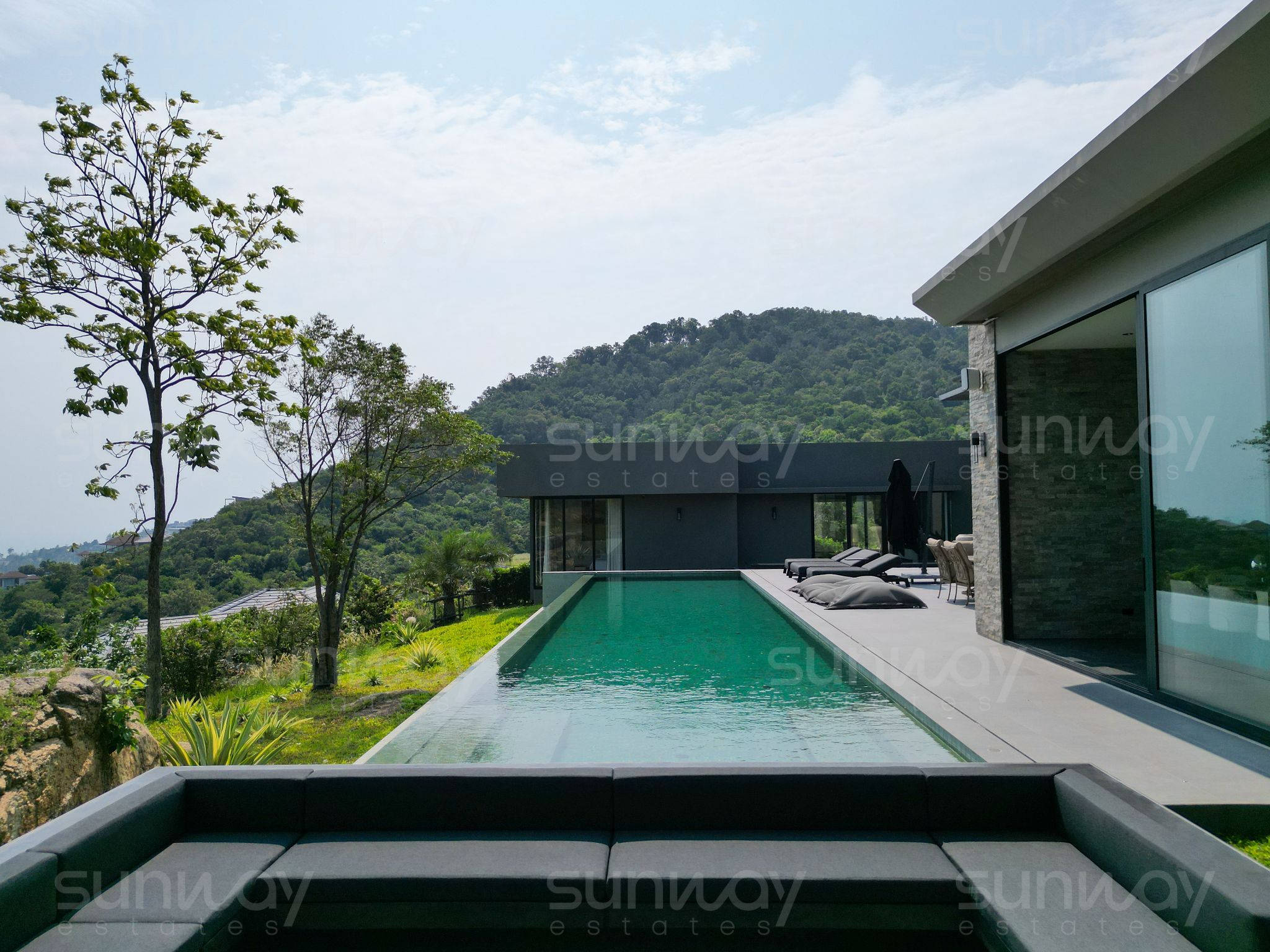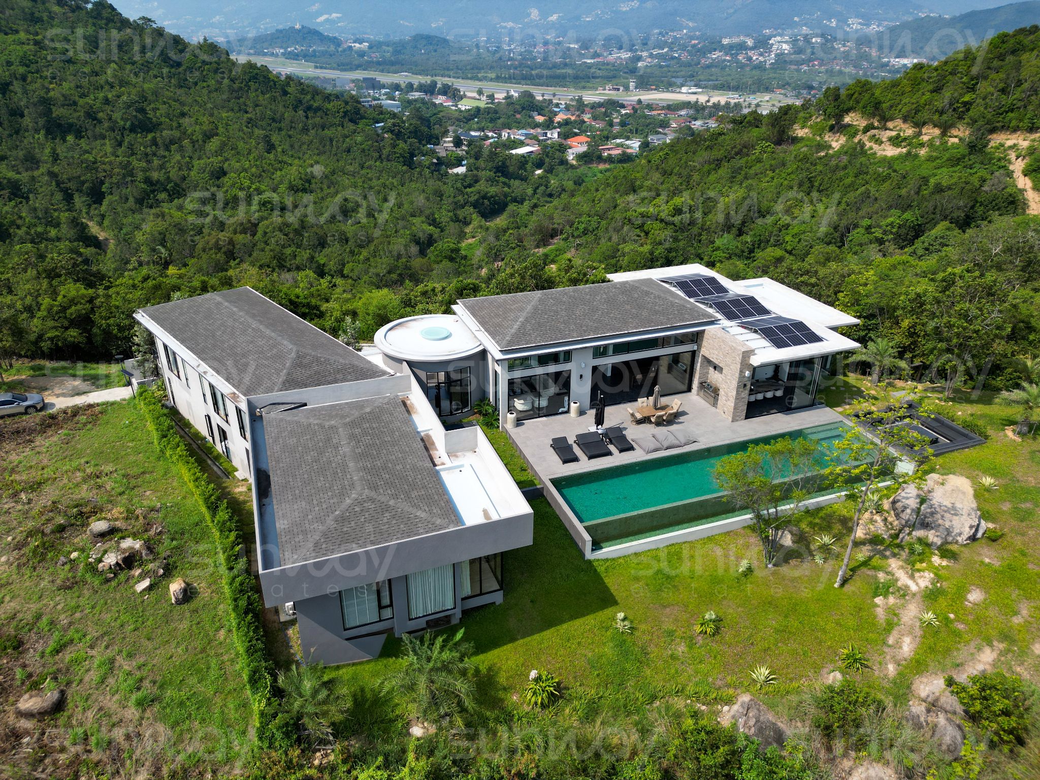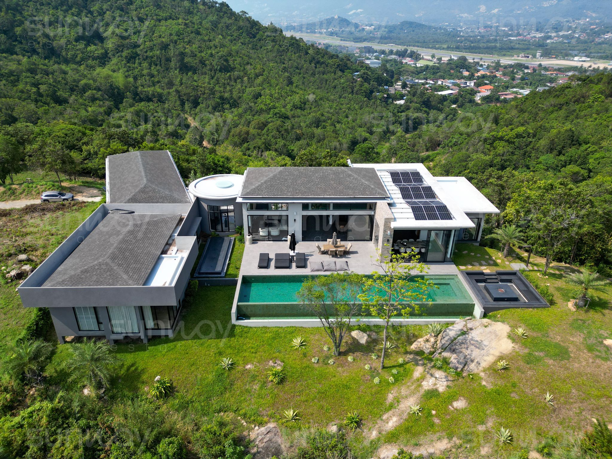 Villa Raphy is a grand, architect-designed estate perched atop the mountain ridge in Plai Laem, one of Koh Samui’s most prestigious residential enclaves. Blending bold design with natural serenity, this remarkable villa enjoys sweeping sea views to the front and lush mountain views at the rear—along with a rare overlook of the Samui airport runway. Set on a spacious 1,880 sqm end-lot with direct access and unmatched privacy, the property borders protected forest land, offering permanent green surroundings that can never be developed.