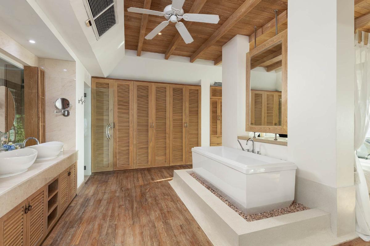 Step outside to take in the expansive outdoor areas of the villa: a big covered terrace with dining and lounging areas overlooking the pool and sea. A spacious pool deck with sun loungers and a shaded awning for alfresco relaxation. Lush tropical landscaping and water features creating a peaceful ambiance.