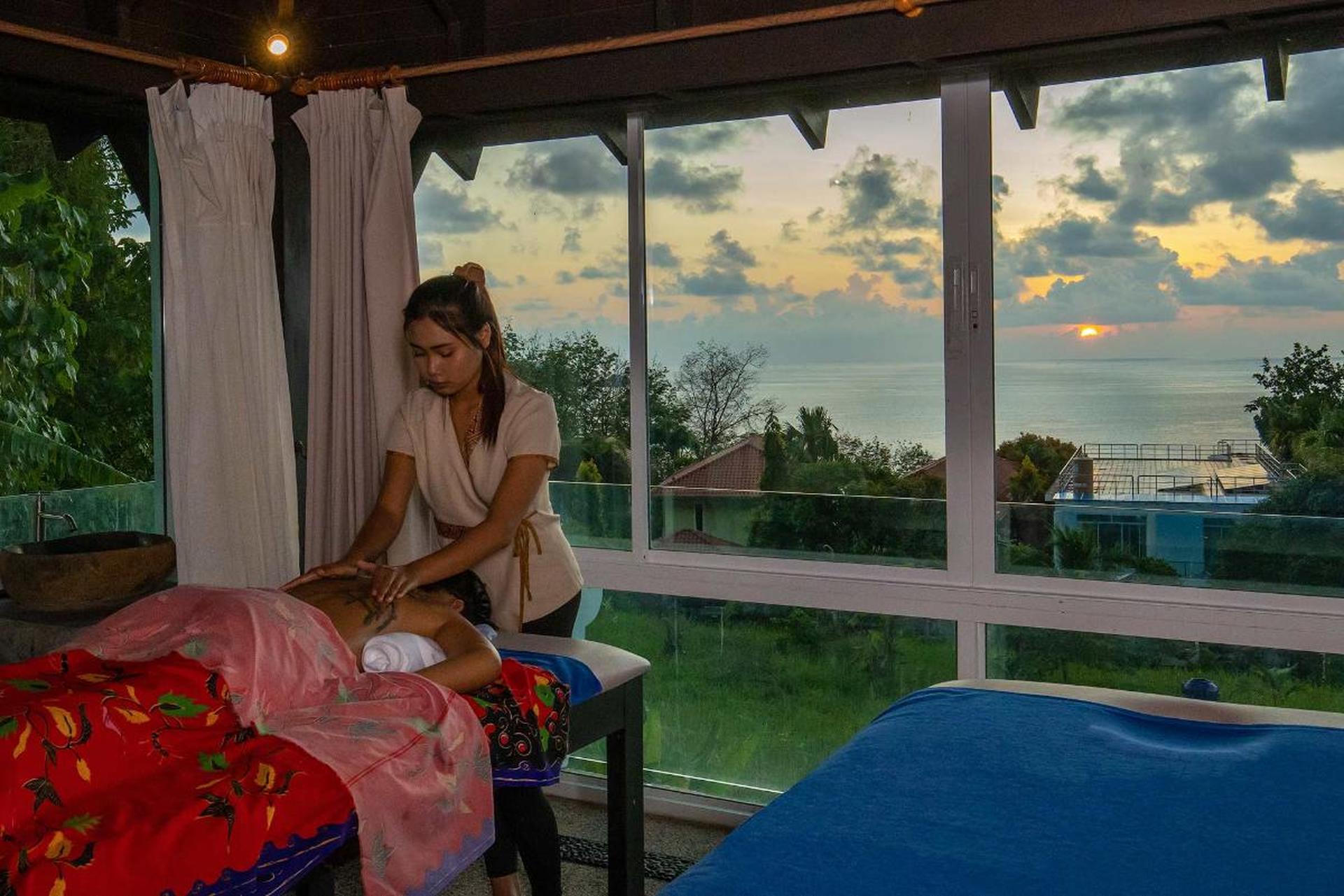 Massage sala and outdoor patio with unbroken views of the mountain and sea.